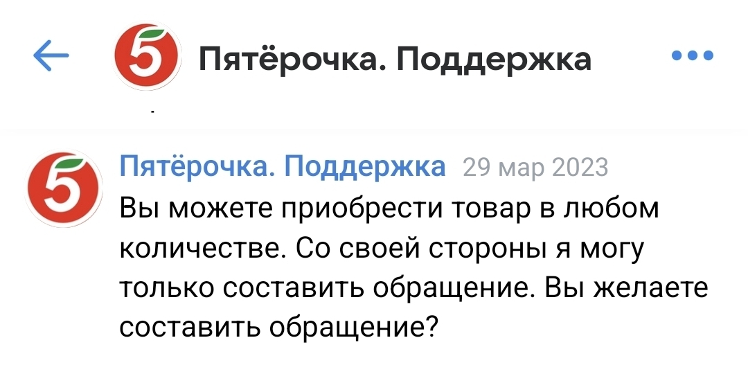 Я был всё еще голодный и еще более злой! Выйдя из магазина, написал свое возмущение где-то в соцсетке в официальном акке пятерки. Ответили, что ограничений на продажу штучного товара нет, с продавцом разберутся. И, видимо, разобрались: при виде меня в магазине такую гримассу корчила, будто я ей что-то должен.