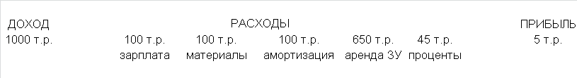 Маркс рассматривал проценты, уплачиваемые за кредит, как часть прибавочной стоимости созданной рабочим. Проще говоря, с марксисткой точки зрения, капиталист рассматриваемого предприятия перераспределил прибавочную стоимость в размере 700 т.р. на 3 части: 5 т.р. себе, 650 т.р. капиталисту-арендодателю, 45 т.р. капиталисту-банкиру.