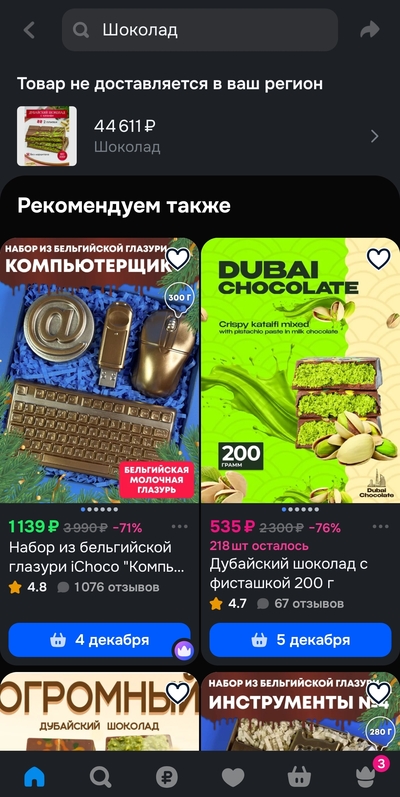 А самое смешное в данной ситуации - когда я смотрел по ссылке тот шоколад, у меня ПВЗ крымский стоял, я как раз накануне родителям кой-чего заказывал и забыл поменять пункт.Так что это в Крым отчего то такой шоколад не везут)))