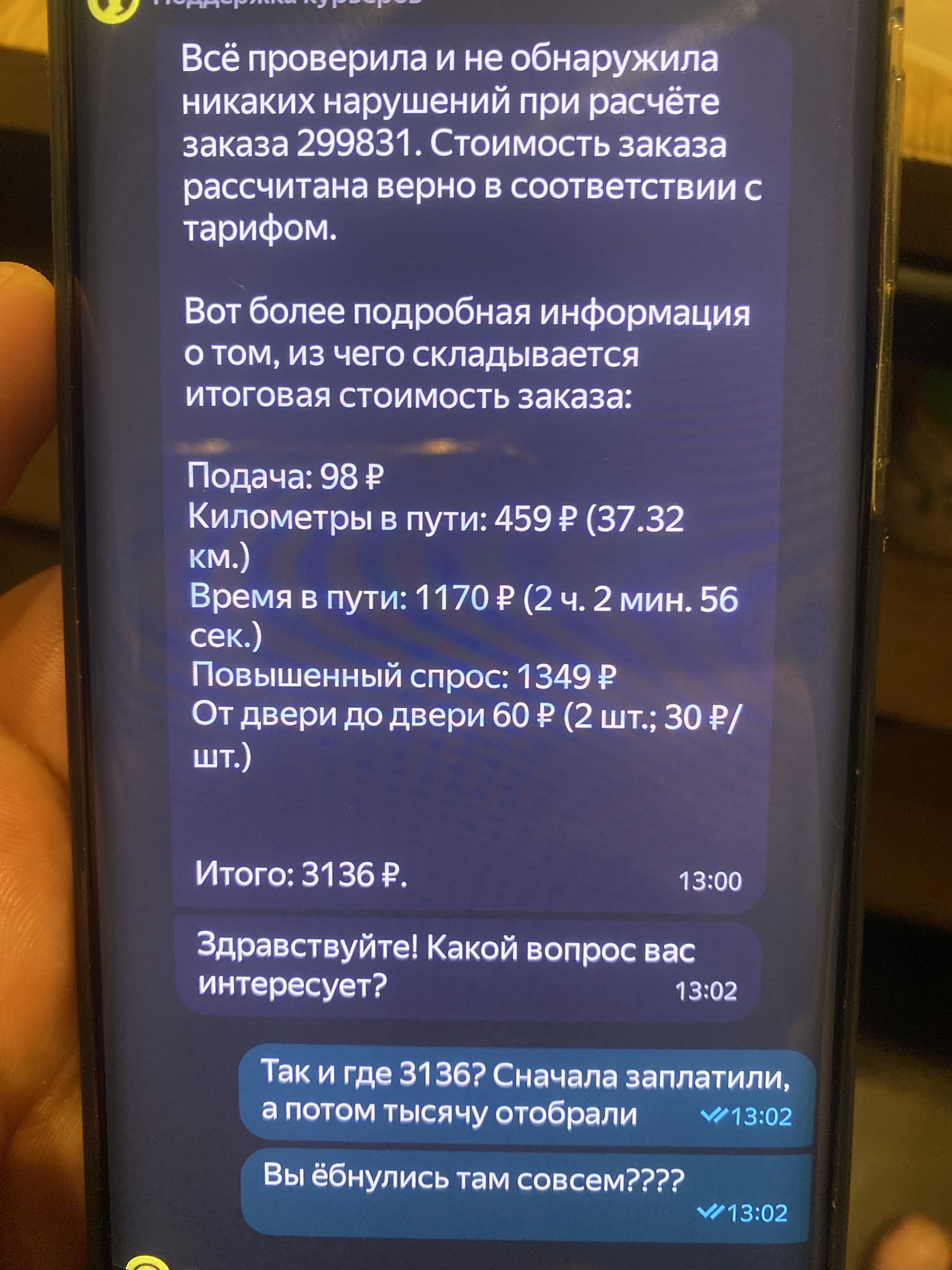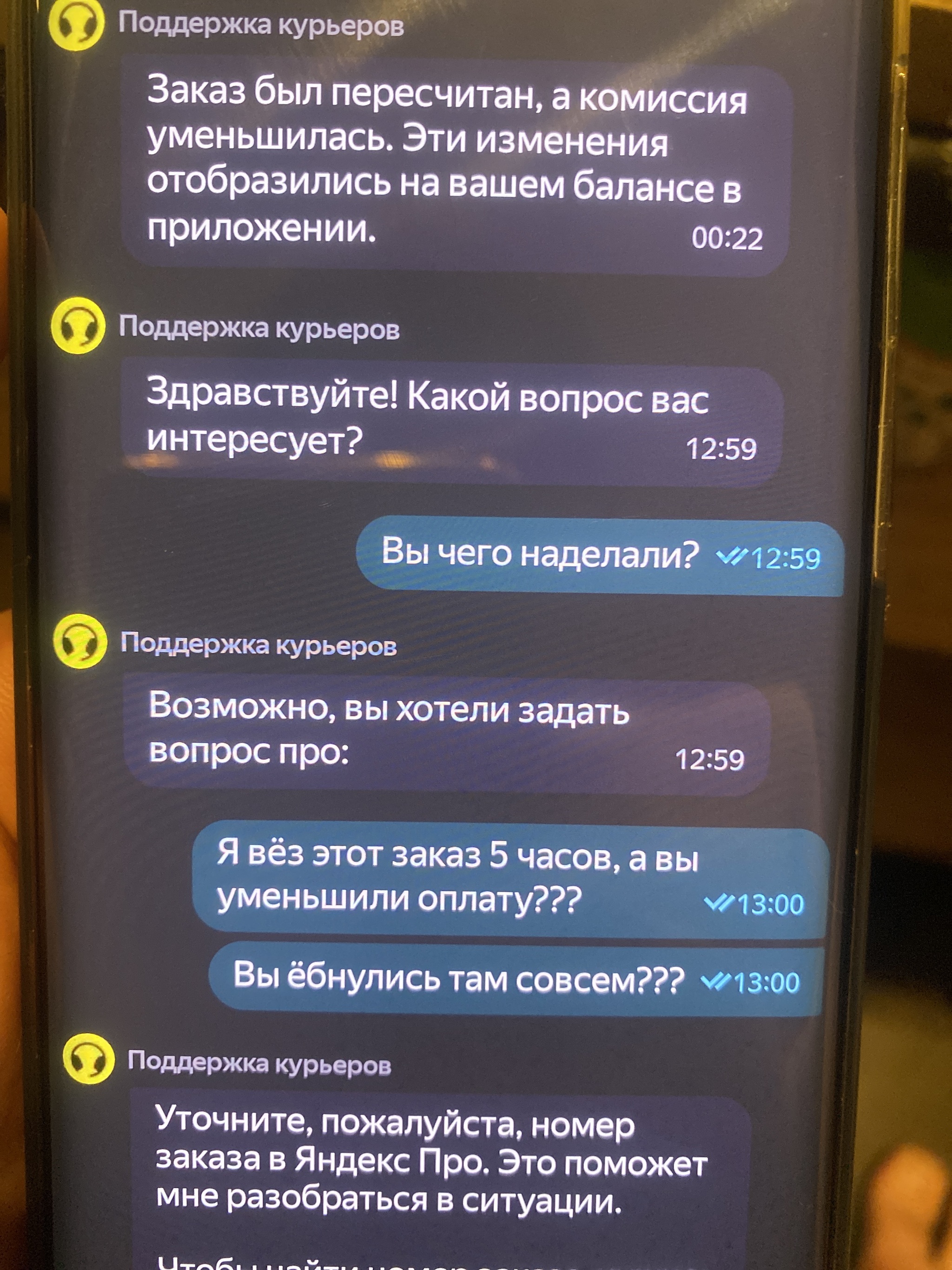 Заказчик, кстати, перевёл косарь чая лично на карту, за пробки, 5 часов поездки и того, что я вошёл в положение и привёз по другому адресу, он наверное теперь думает, какой же Яндекс хороший и услуги доставки в нём хорошие, а курьеры - вообще душки. И в итоге я почти вышел в 0, с этой хуйнёй, но увидев утром на балансе Яндекс.про -1200 - у меня прям жопа сгорела.