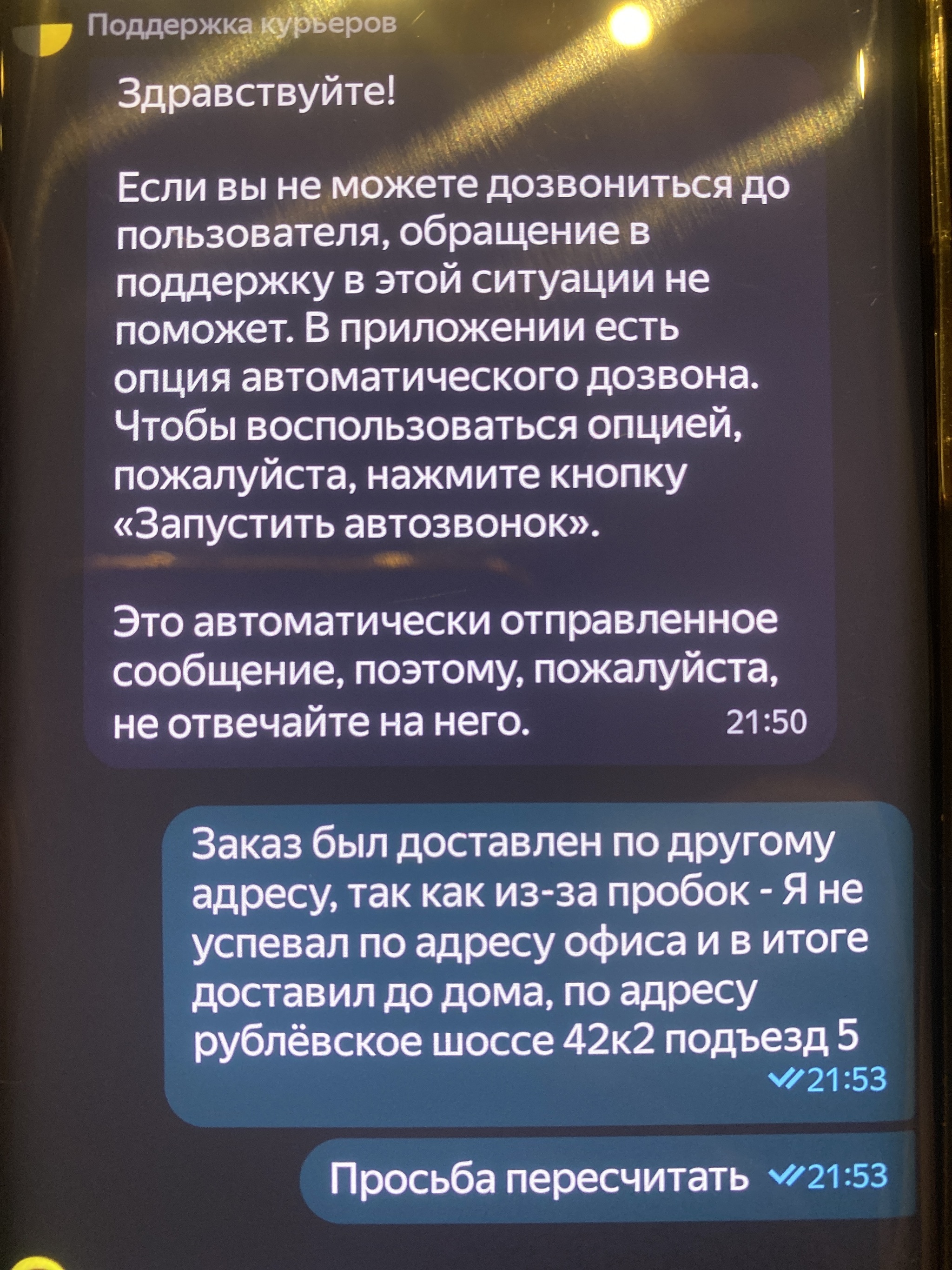 Пока стоял в пробках - получатель позвонил и сказал, что понимает весь пиздец на дорогах, но адрес придётся изменить, так как изначально нужно было доставить в офис, но офис закрывается в 20 часов, потому попросил перенести адрес уже ему до дома, о чём я написал в поддержку.