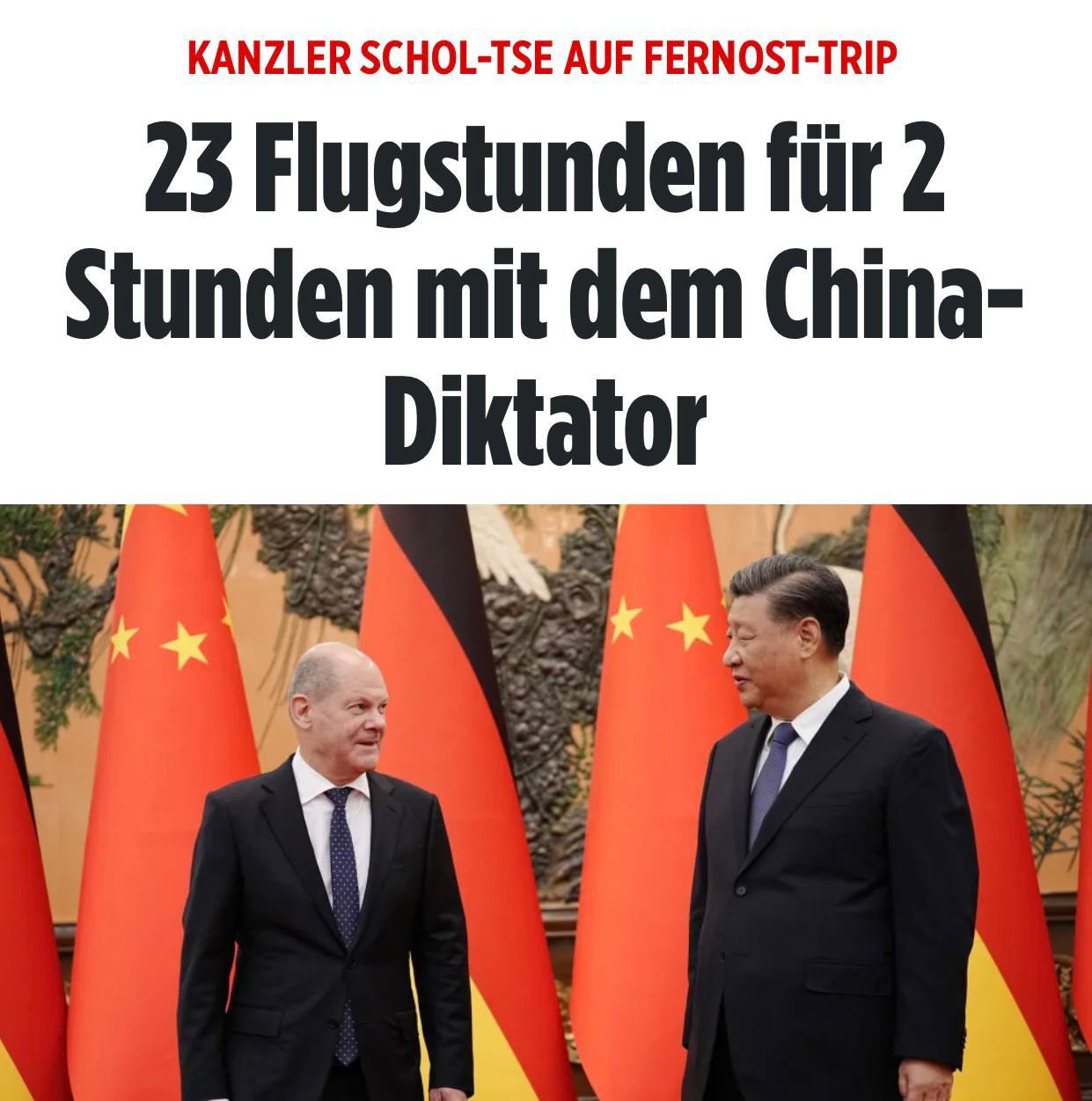 Это были 23 часа полета ради 2 часов с китайским диктатором. Почти сутки перелёта, Шольц захватил с собой очень большое количество руководителей ведущих, немецких предприятий (Bayer, BASF, Volkswagen, Siemens, Merck, Adidas, BMW, BioNTech).