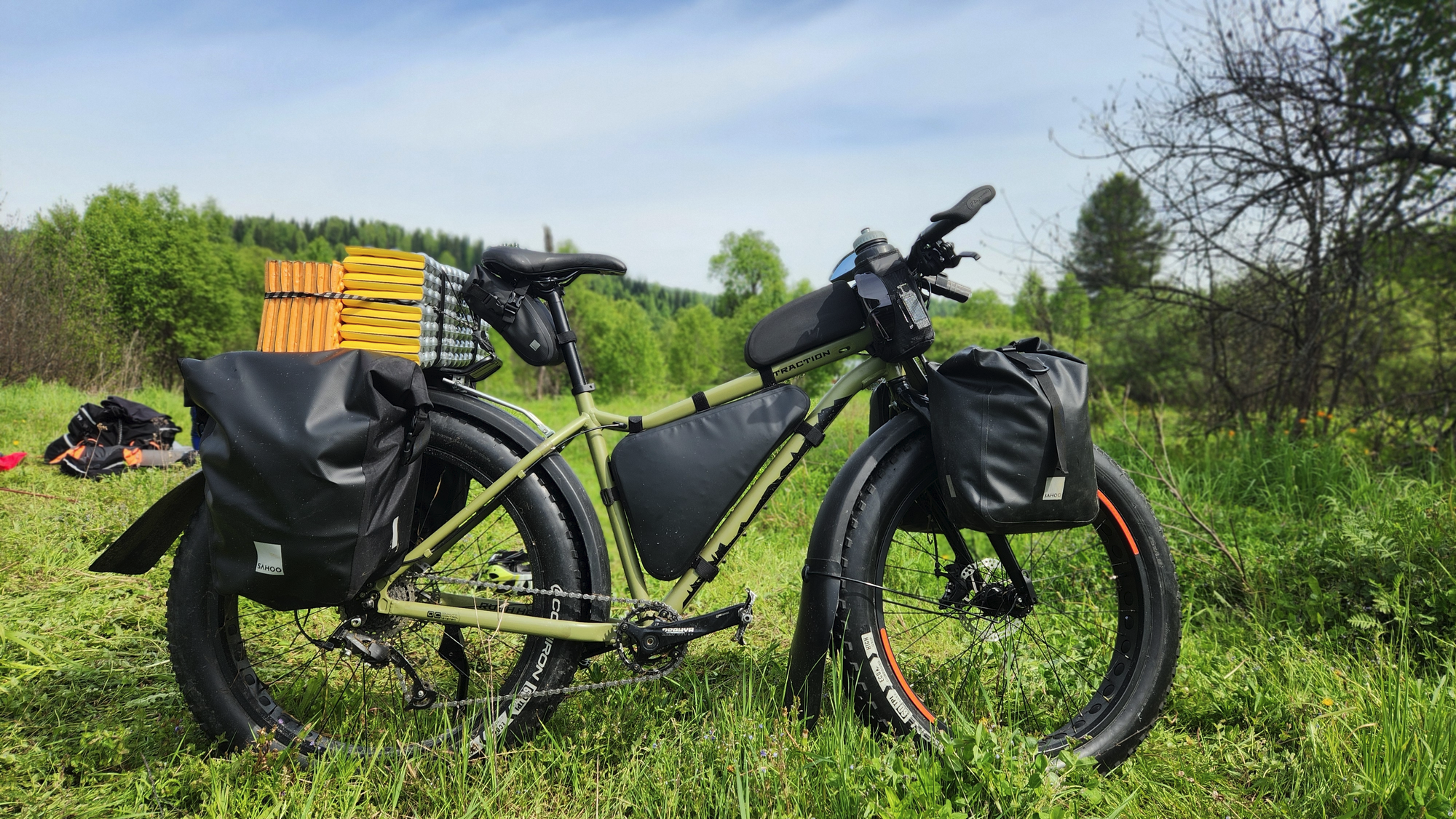 Сумки Sahoo, два комплекта, по 10 и по 20 литров, недалеко вешаю маленькие. Прям все четыре тоже могу, но это был загруз на двоих туристов )