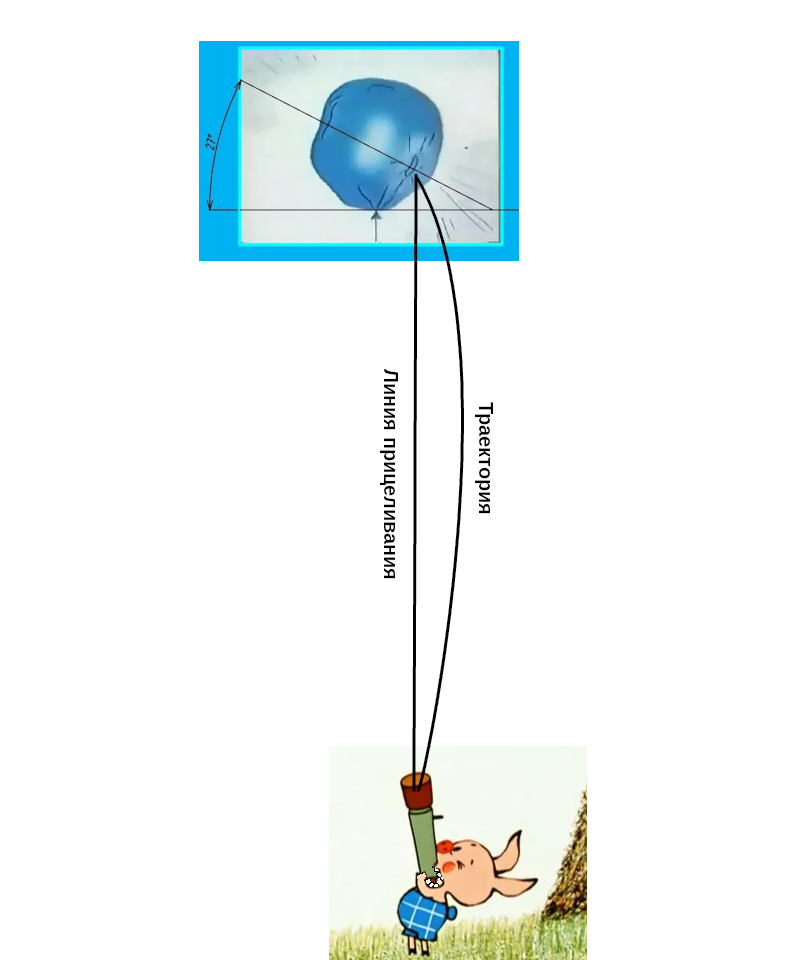 Если продолжить траекторию снаряда, можно увидеть, что выходное отверстие в шаре не совпадает с указанной схемой. НО... У Пятачка не просто ружье. Его оружие является мортирой, то есть стреляет по более навесной траектории.