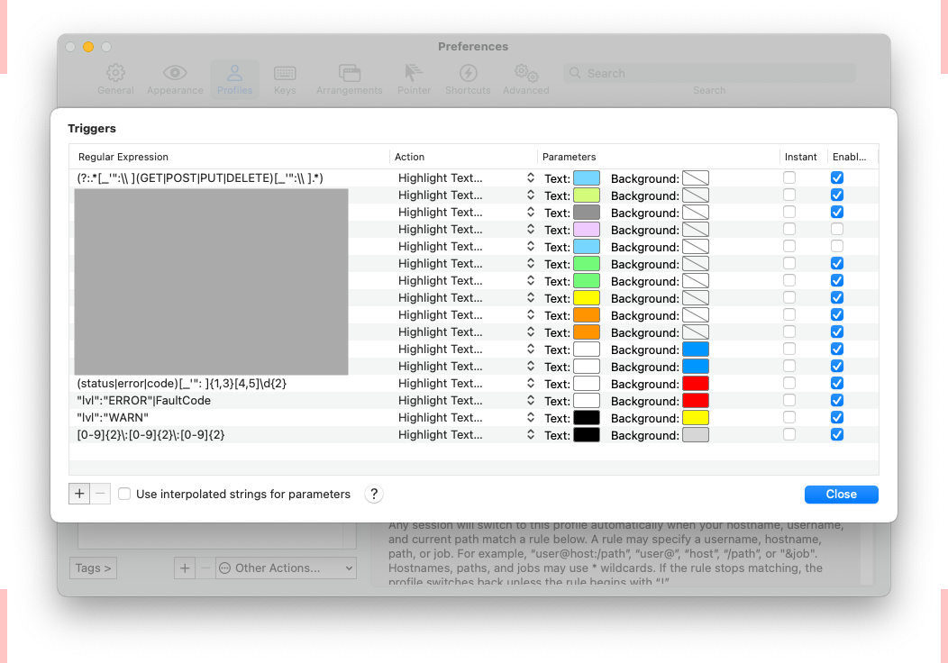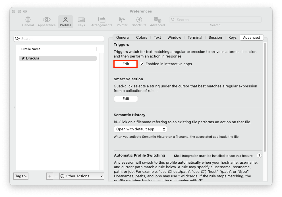 У этого терминала есть много достоинств, но в контексте нашей проблемы нам нужна только возможность работы с буфером. iTerm2 умеет его обрабатывать регулярными выражениями и имеет форму настройки триггеров, позволяющих производить какие-либо действия при срабатывании регулярки. Находятся они в Profiles - Advanced - Triggers.