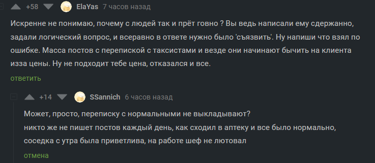 Сейчас 18 вечера, пора домой, спокойно доеду и поиграю/постримлю, жаль не на такси, так бы мог рассказать еще и о переписке с нормальным таксистом, так как неадекватных мне пока не попадалось (езжу, правда редко). Всем спасибо за внимание! Верю, что было очень интересно