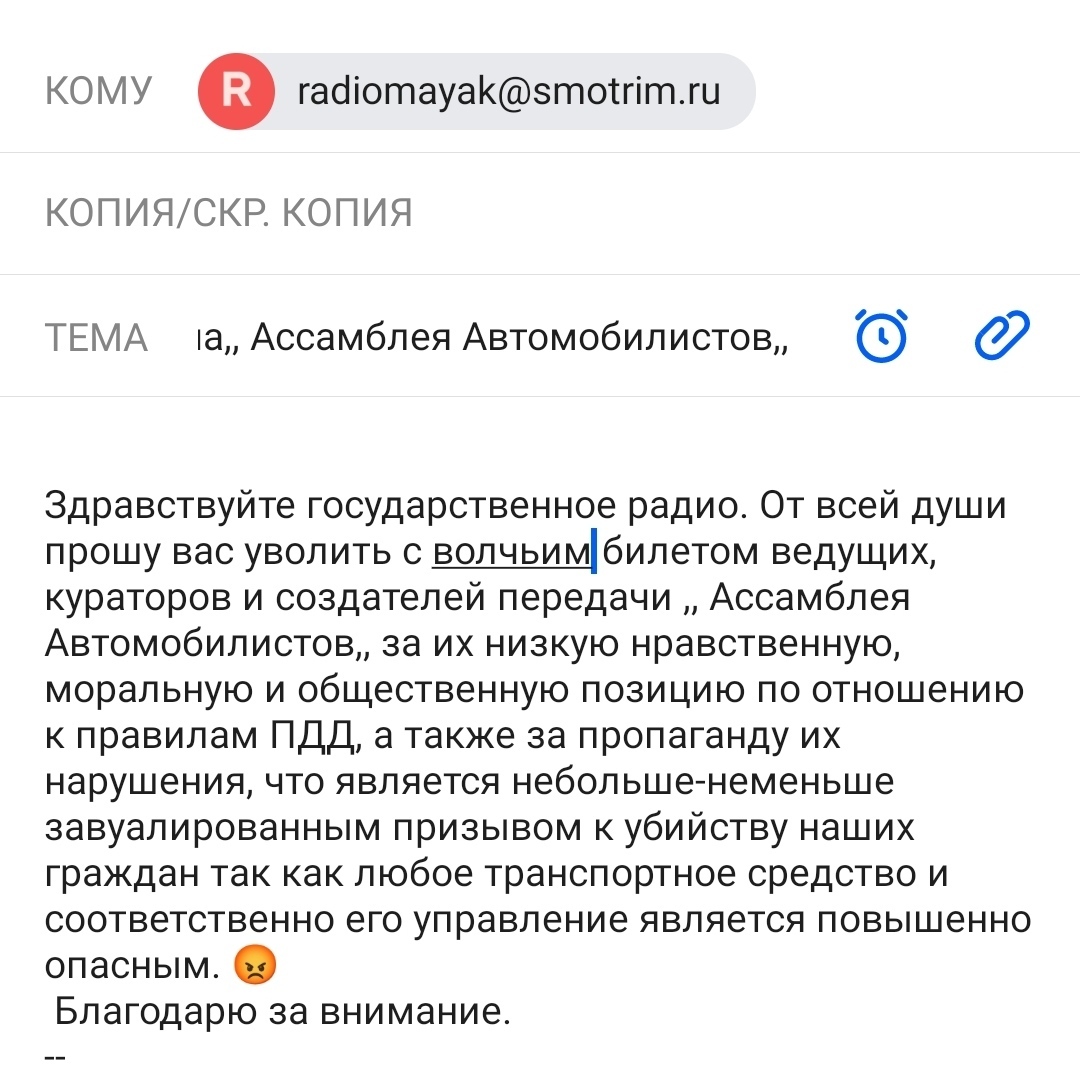 Здравствуйте государственное радио. От всей души прошу вас уволить ведущих, кураторов и создателей передачи ,, Ассамблея Автомобилистов,, за их низкую нравственную, моральную и общественную позицию по отношению к правилам ПДД, а также за пропаганду их нарушения, что является не больше-не меньше завуалированным призывом к убийству наших граждан, так как любое транспортное средство и соответственно его управление является повышенно опасным.