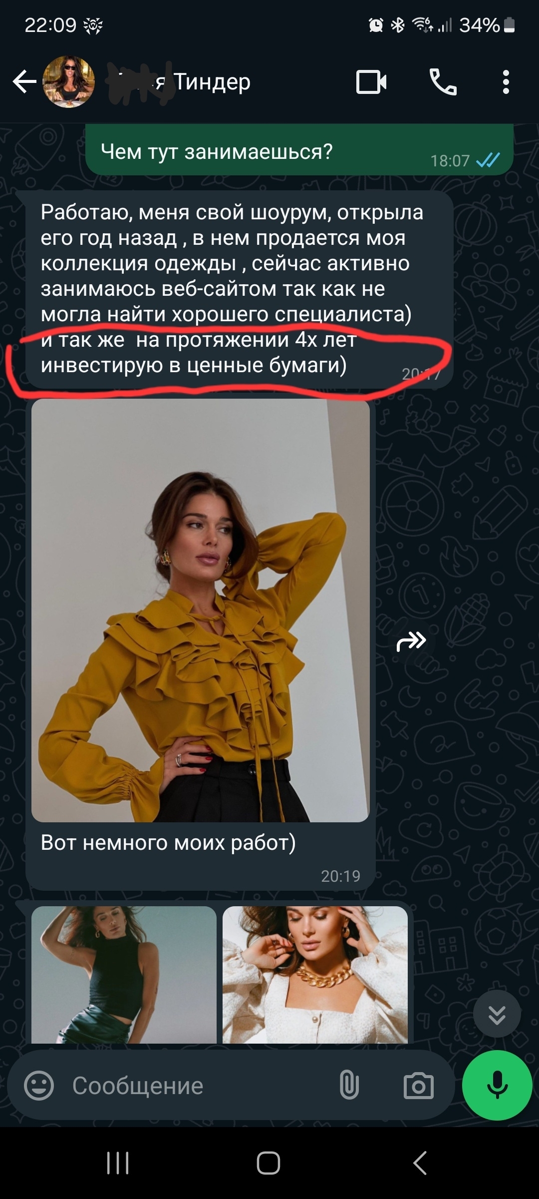 Я таких в тиндере штук 6 наковырял за последние 3-4 месяца. У всех одинаковая методичка. И вот на днях еще 4 лайкнули. Одинаковый возраст (примерно), одинаковое количество фотографий, одинаково живая беседа, прям интересуется тобой, шутит. Одинаковая лживая история: сейчас нахожусь там то (Краков, Рига, Варшава, Нюрнберг и тд. чуть чуть подальше от тебя, что бы не вызвал на встречу), бизнес такой-то, времени полно, делегирую свои обязанности, а сама шоплюсь, спортом занимаюсь и путешествую. А ну и еще брат/сват/срат/хуят занимаются профессионально инвестициями, и я тоже бабло заколачиваю. Давай вместе? Прикинь, как классно, вместе живём, вместе бабло гребём, домик купим... уххх заживём! Но это позже в диалоге будет, а пока....