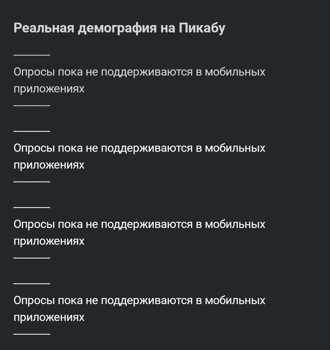 10 Nosf3ratukzn Ответ на пост «Реальная демография на Пикабу»5 8 месяцев назад Храни Господь мобильное приложение, которое не показывает ни опросов, ни донатов, ни рекламы. Зато минусы видно. [моё] Опрос Демография Пикабушники Волна постов Ответ на пост Ещё 0