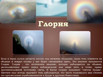 Броккенский призрак - тень наблюдателя на поверхности облаков (тумана) в направлении, противоположном Солнцу.