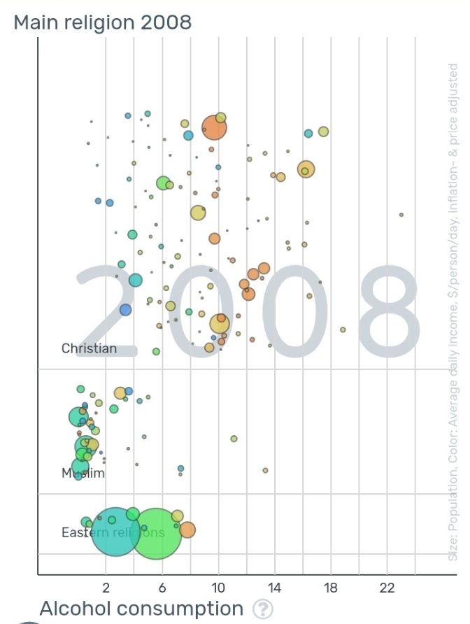 Я нашёл это, но там основная религия, а не степень религиозности. Цветом обозначается доход. Холодные цвета-низкий доход, тёплые -высокий. https://www.gapminder.org/tools/#$model$markers$bubble$encoding$size$data$space@=geo&=time;;&scale$domain:null&type:null&zoomed:null&extent@:0&:0.74;;;&y$data$concept=main_religion_2008&space@=geo;;&scale$domain:null&zoomed:null&type:null;;&x$data$concept=alcohol_consumption_per_adult_15plus_litres&space@=geo&=time;&source=sg;&scale$domain:null&zoomed:null&type:null;;&color$data$space@=geo&=time;&concept=mincpcap_cppp;&scale$type:null&domain:null&zoomed:null&palette$palette$25:null&36=#30a3e8&65=#e2c75a&75:null;;;;&frame$value=2008;;;;;&chart-type=bubbles&url=v2