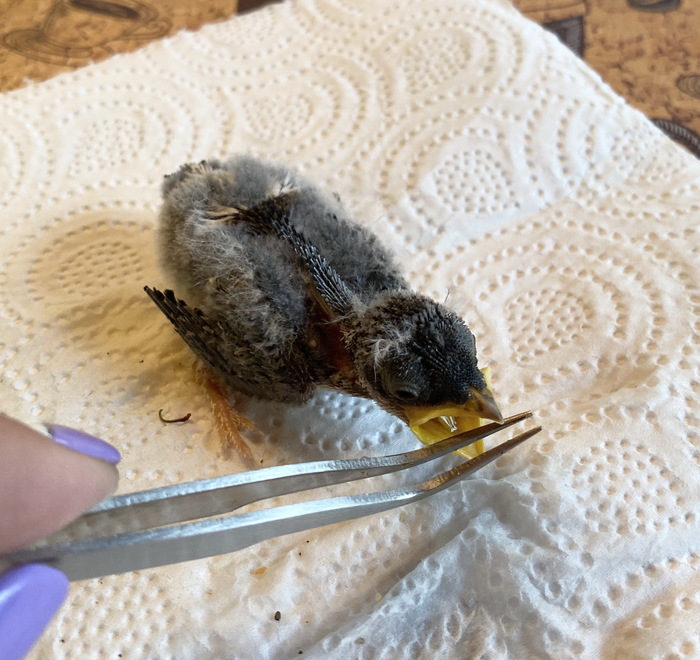 Кормить было нечем и пришлось покормить жеваной булкой. Ночь просидев на птичьих форумах, мы уже знали, что кормить булкой нельзя. Нужны сверчки – живые или замороженные. Спасибо молодому человеку из Серпухова, который стал нашим поставщиков сверчкового товара. Привозил тугой брикет в фольге прямо к КПП нашего поселка. Сверчки, кстати, стоят недешево. И запихать сверчка в птенца невозможно – он слишком большой. Потому мы кормили птенца пинцетом для алмазной мозаики ))) Предварительно разорвав сверчка на части.