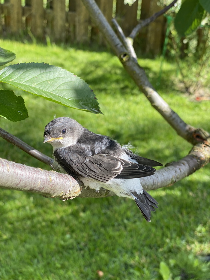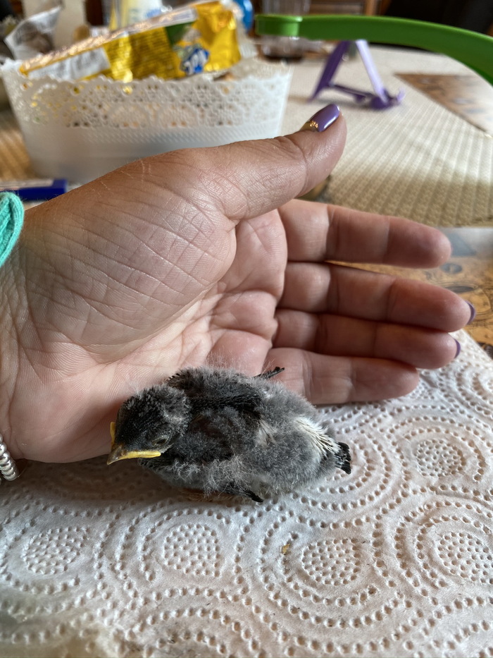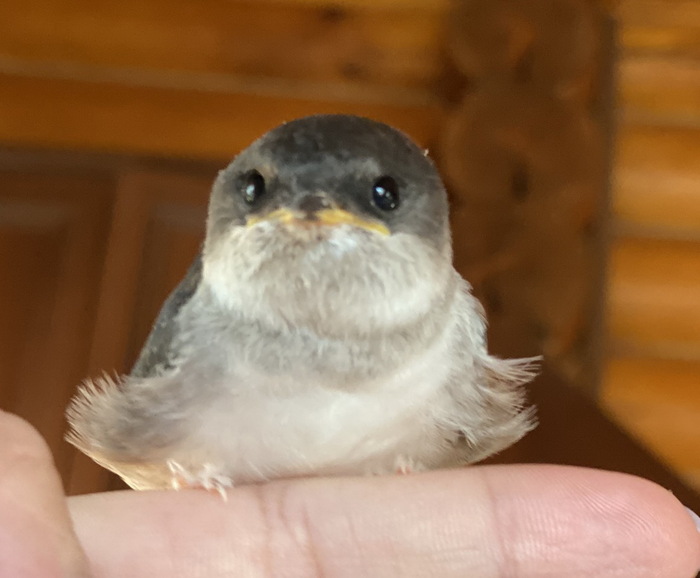 На даче под самой крышей у нас уже многие годы существует ласточкино общежитие из 11 гнёзд. Крик, ор, «да я вам на голову нагажу и мне ничего не будет» - 13 лет терпим. И вот в дождливый июльский день, спускаясь по лестнице со второго этажа, увидели на крыше парковки упавшее гнездо и двух птенцов. Один был меньше и погиб, второй упорно полз в сторону окна.