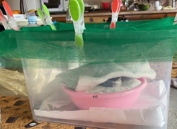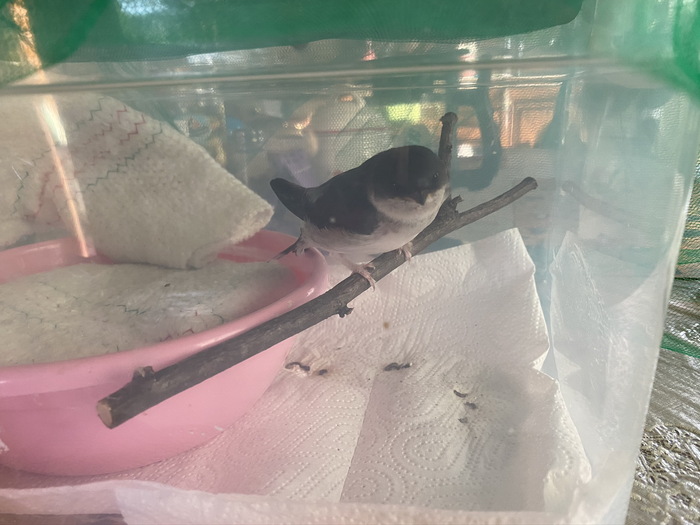 К этому времени мы переселили птенца в контейнер, закрытый сверху москитной сеткой. В контейнер поставили веточку.