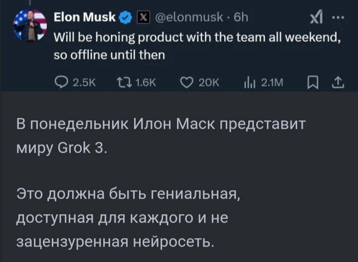 5196 Wolfl иноагент Ответ на пост «Самый умный ИИ на Земле выйдет уже завтра»7 9 месяцев назад "Доступная для каждого" Искусственный интеллект Нейронные сети Илон Маск Мемы Ответ на пост Скриншот Волна постов Санкции Обман Недоступен Нейросеть Grok 178 10 7 5 Ещё 0