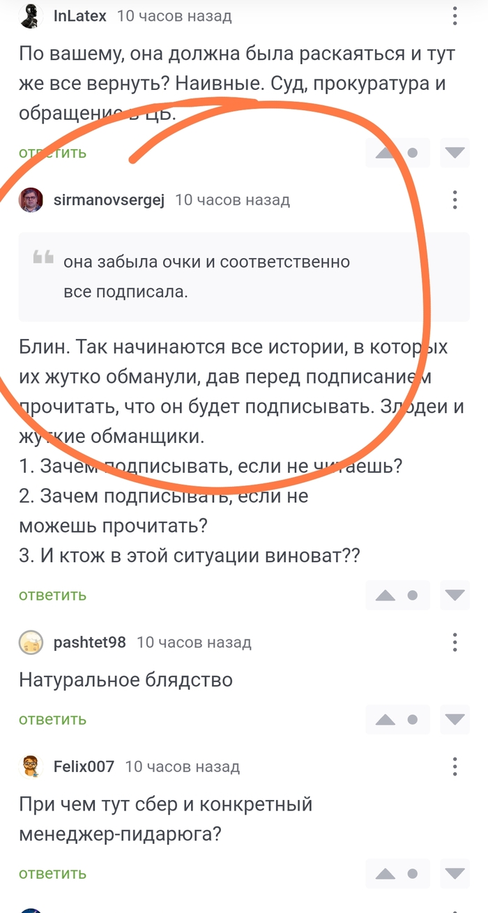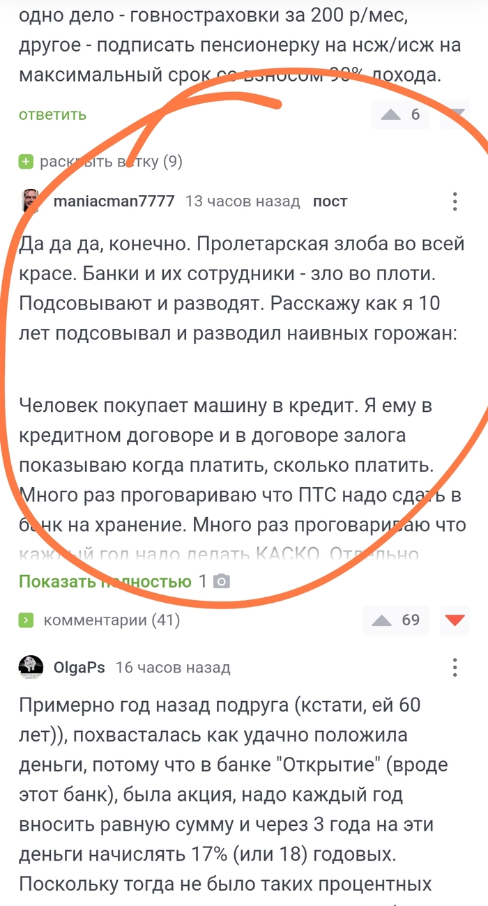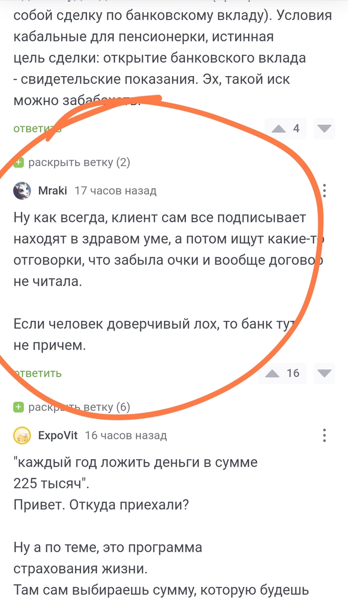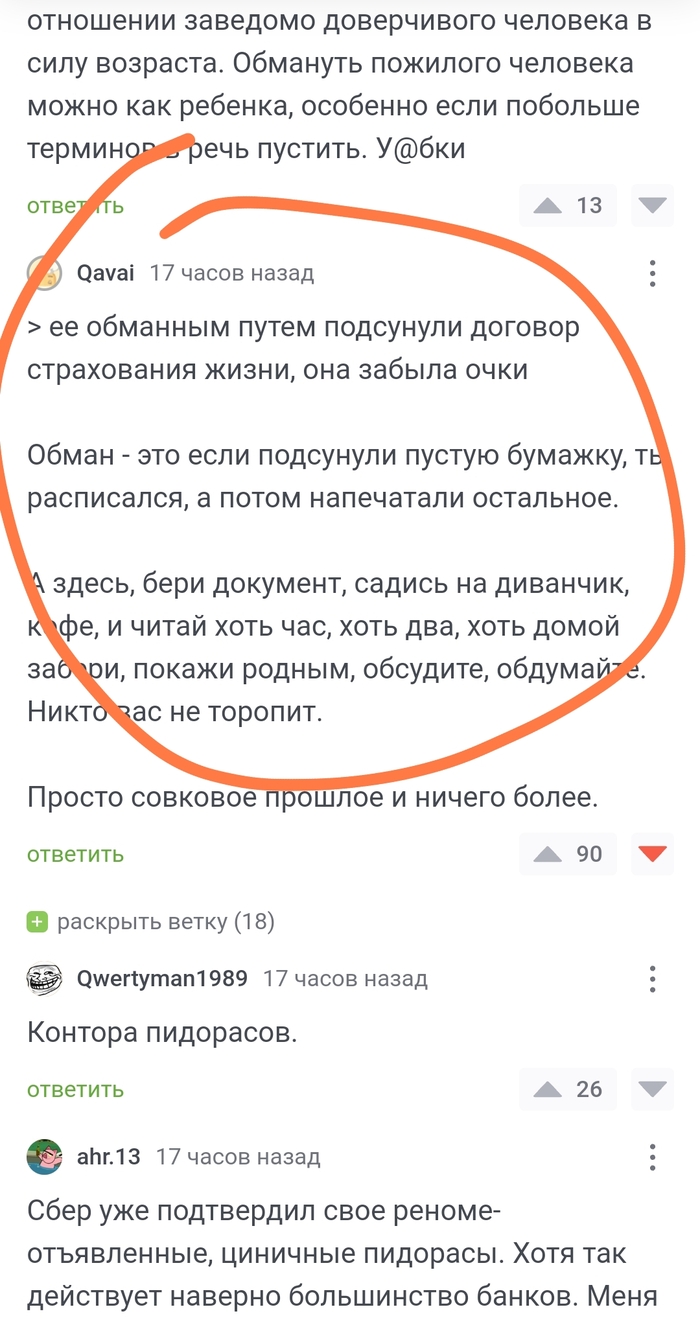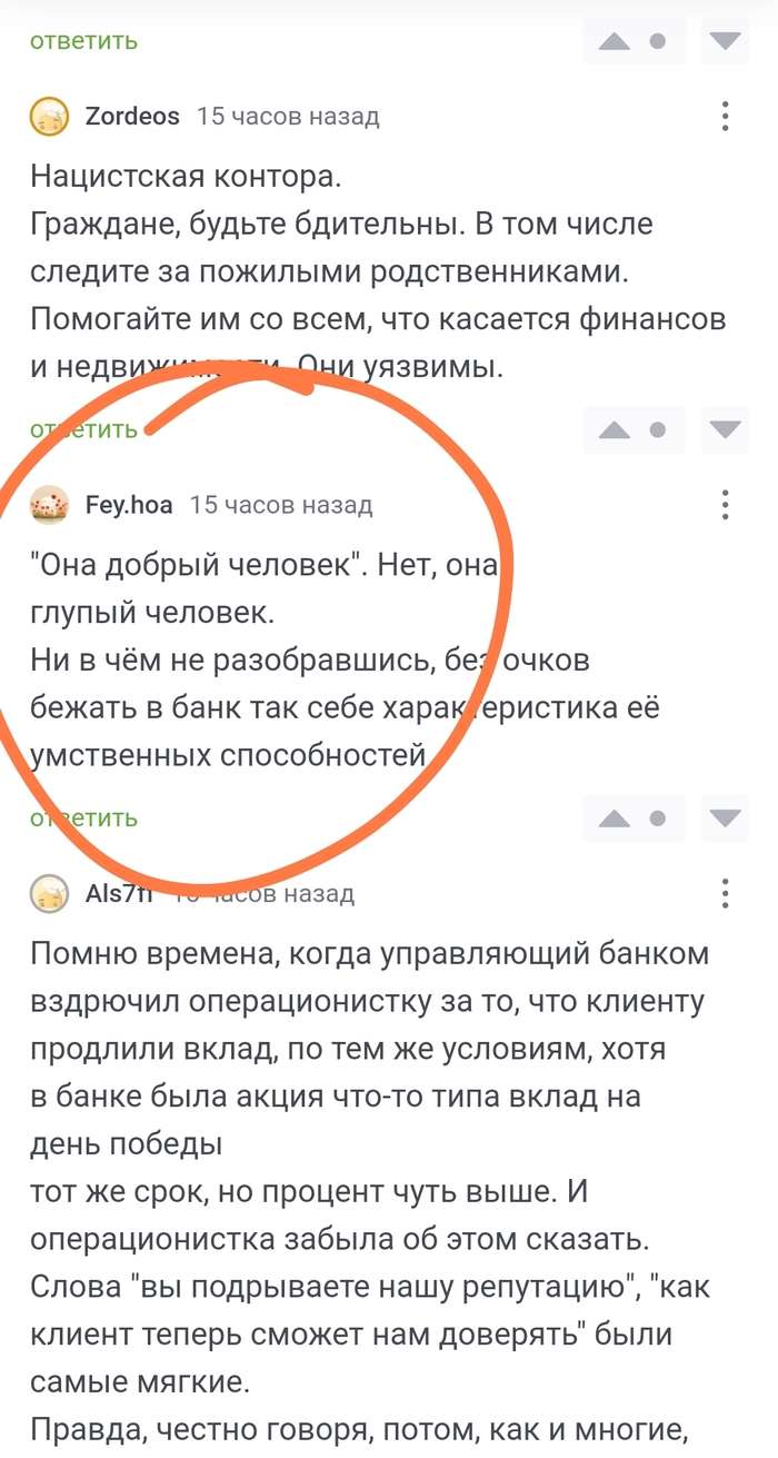 Что стало с нашим обществом? В комментариях находятся не мало тех кто оправдывает банки, ругают стариков за отсутствие очков. Вы что, серьёзно? Вам русским языком по белому написано - звонили по продлению уже имеющегося договора, ничего нового что надо вычитывать, это во-первых. Во-вторых такие истории не уникальны, таких обманутых старичков много. А старички у нас, представьте себе, доверчивые. Поколение их отцов и матерей отдали жизни в борьбе с фашистами, строили новый мир после войны, и учили своих сынов и дочерей быть добрыми, открытыми, нравственными и честными. И всё советское общество их этому учило, и в том числе учило дотверять государству.