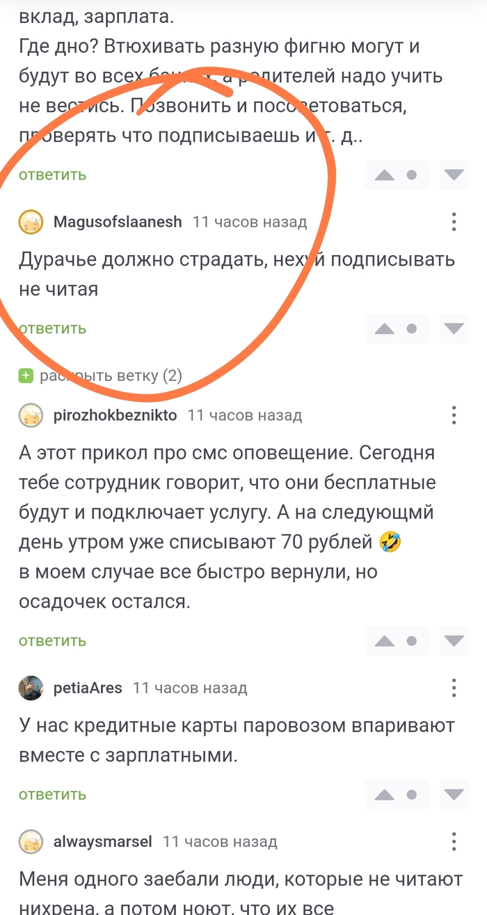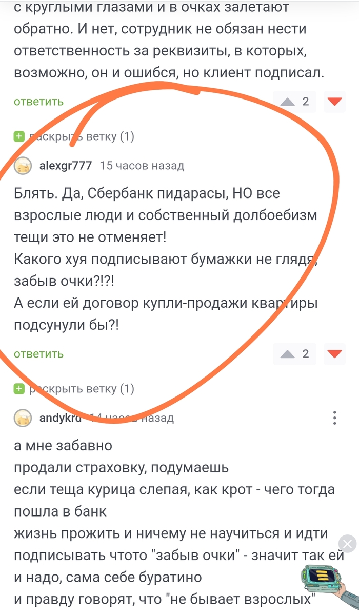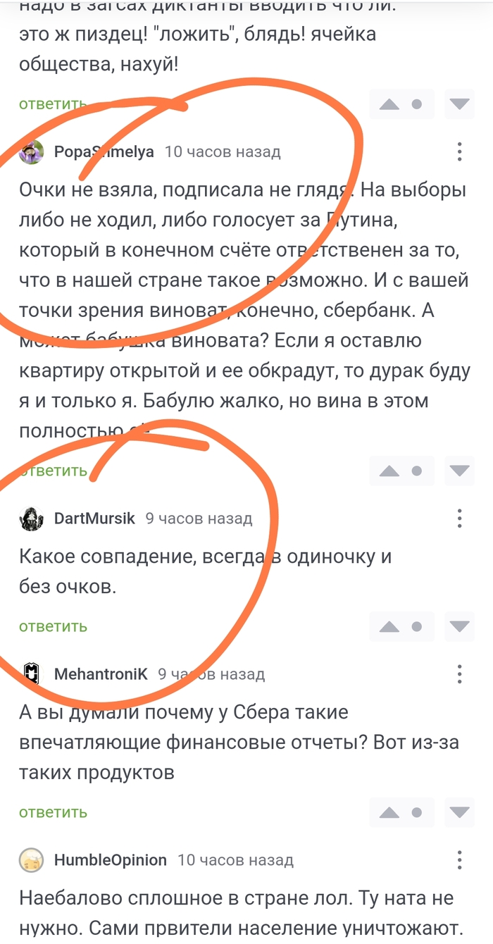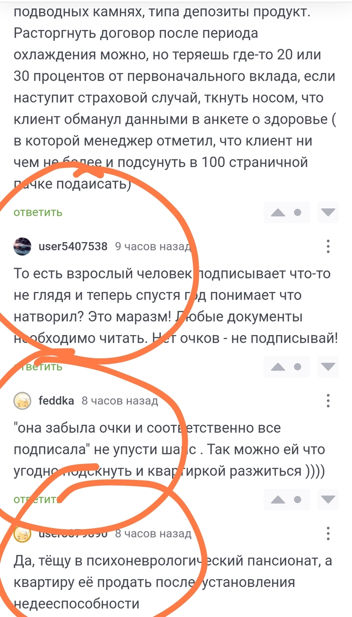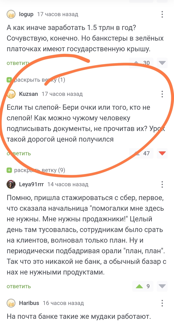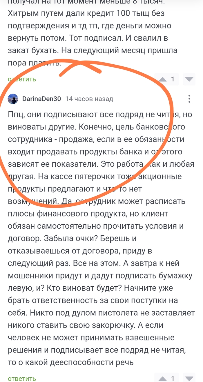 Что стало с нашим обществом? В комментариях находятся не мало тех кто оправдывает банки, ругают стариков за отсутствие очков. Вы что, серьёзно? Вам русским языком по белому написано - звонили по продлению уже имеющегося договора, ничего нового что надо вычитывать, это во-первых. Во-вторых такие истории не уникальны, таких обманутых старичков много. А старички у нас, представьте себе, доверчивые. Поколение их отцов и матерей отдали жизни в борьбе с фашистами, строили новый мир после войны, и учили своих сынов и дочерей быть добрыми, открытыми, нравственными и честными. И всё советское общество их этому учило, и в том числе учило дотверять государству.