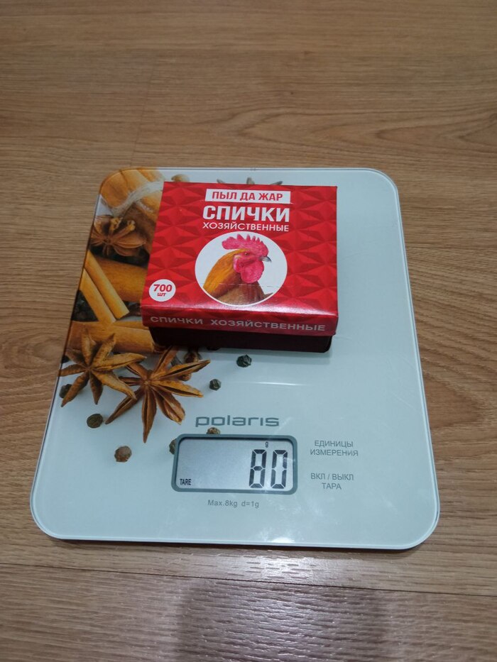 Среднее количество спичек в коробке - 720 шт., что больше заявленного количества на 3%. Качество спичек оцениваю, как приемлемое (с учётом компенсации брака).