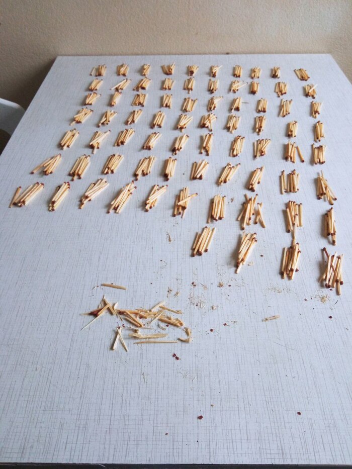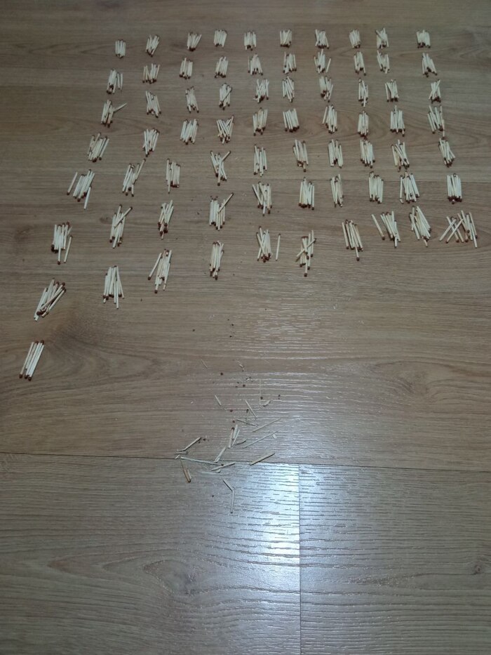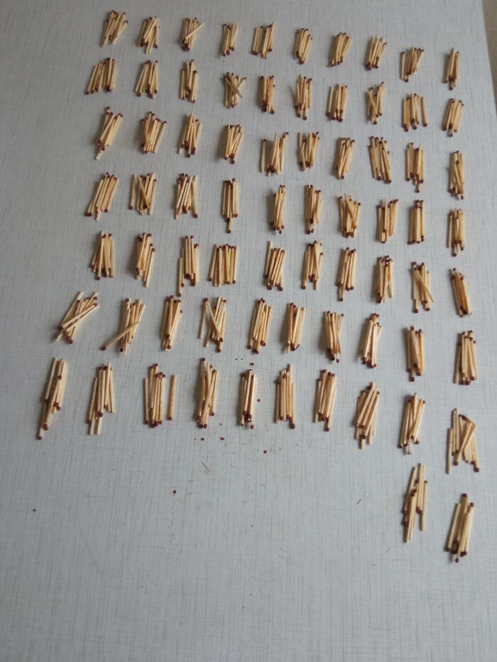 В каждом коробке было около 5% брака (спички без серы, половинки спичек, сломанные, щепки и т.п.). Для подсчёта я учитывал целые спички и сломанные спички, по которым было ясно, что это одна списка. Обломки и щепки не учитывались.