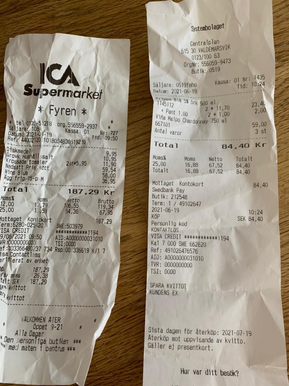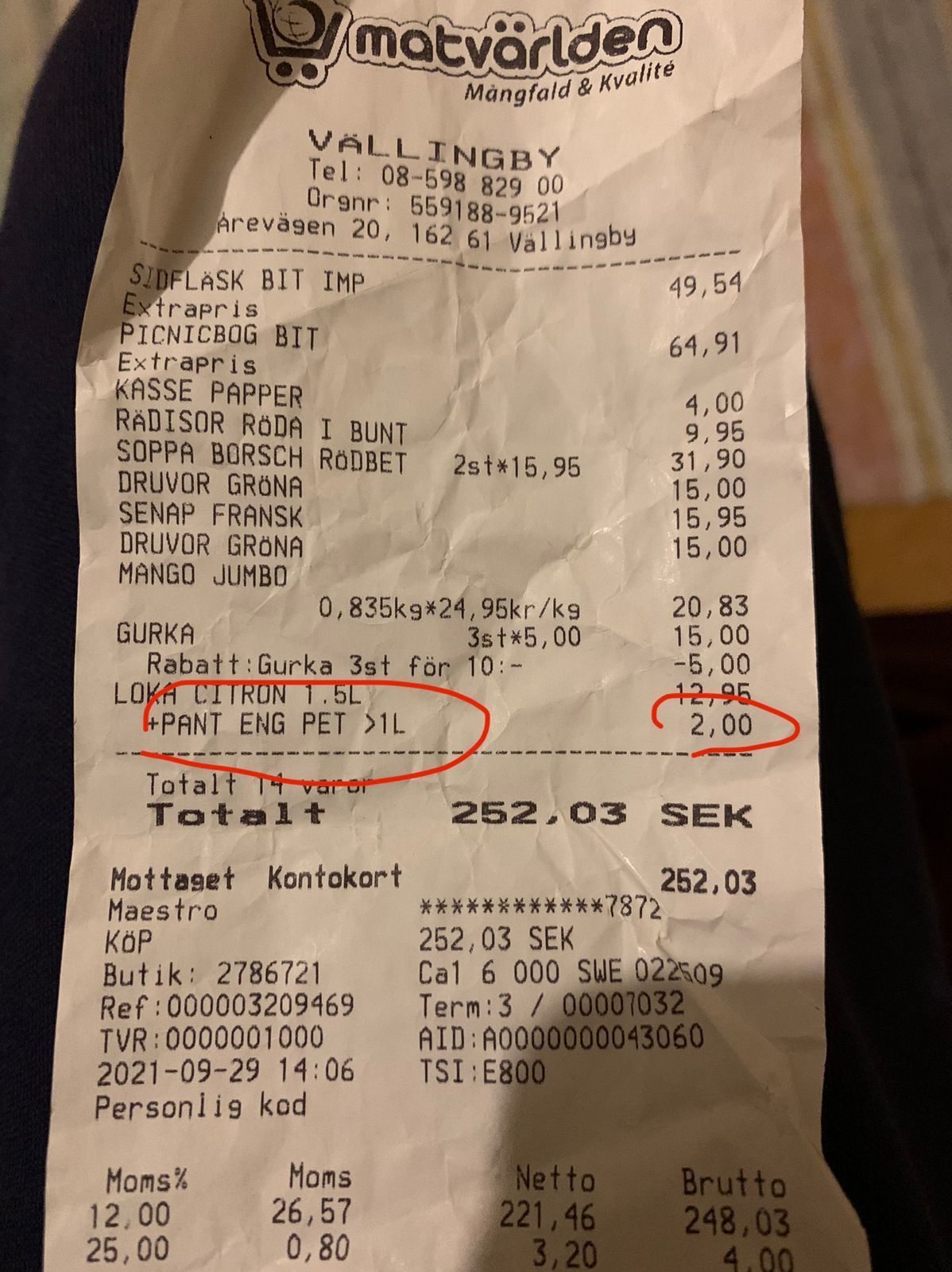 Вот ещё один чек для сравнения. Алкоголя и табака в нем нет, так что сравнить эти пункты не получится. За то видно, что есть возвратный пункт за тару (сдал пустую бутылку - получил скидку на эту сумму).
