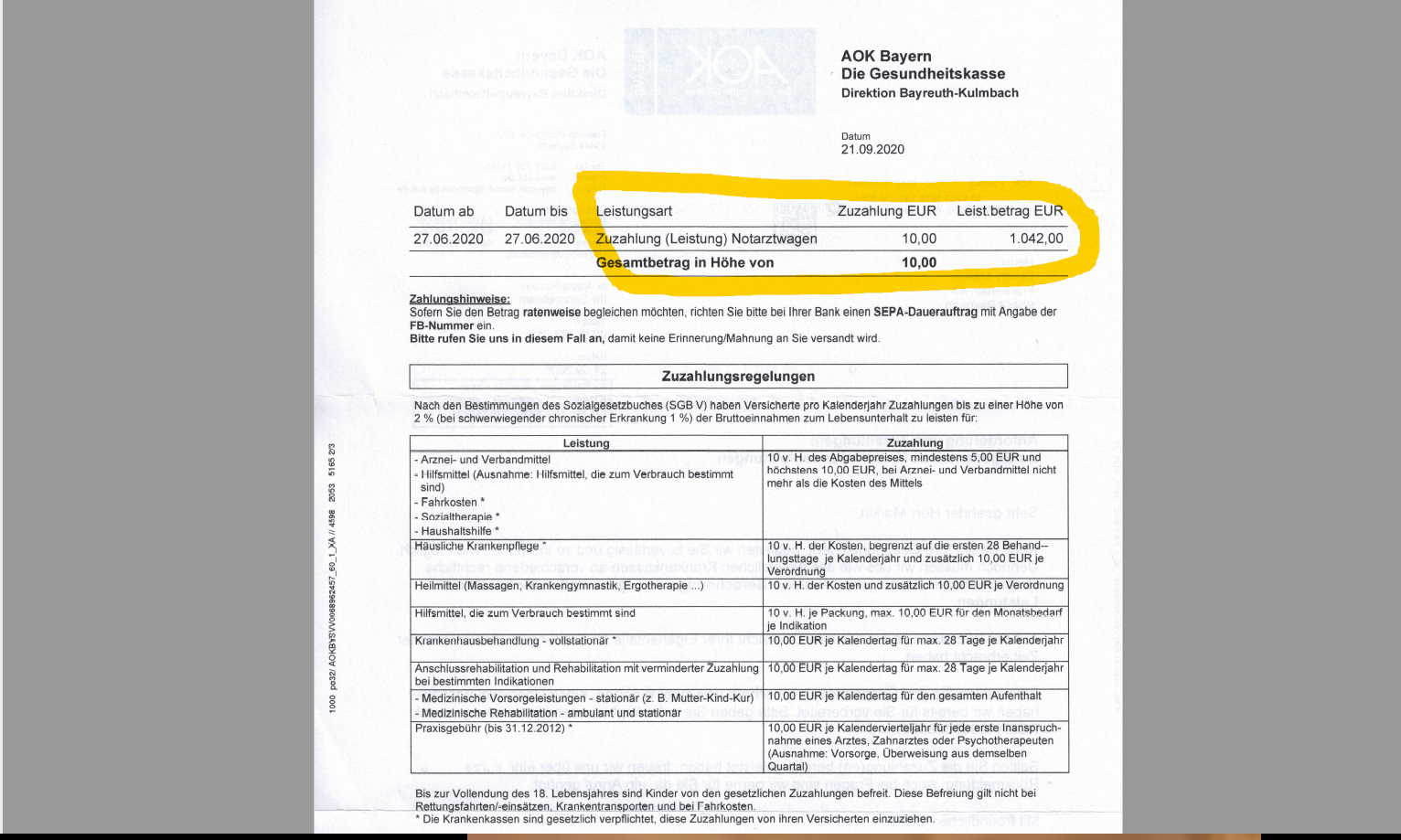 А сегодня мне пришёл счёт за вызов неотложки. Надо же такому случиться, что я пишу ответ на тему вышедшую тоже сегодня. Вот вам картинка, важное я обвёл маркером, цифры справа это стоимость вызова, а слева 10 Евро это символическая личная доля. Так, чтобы помнили.