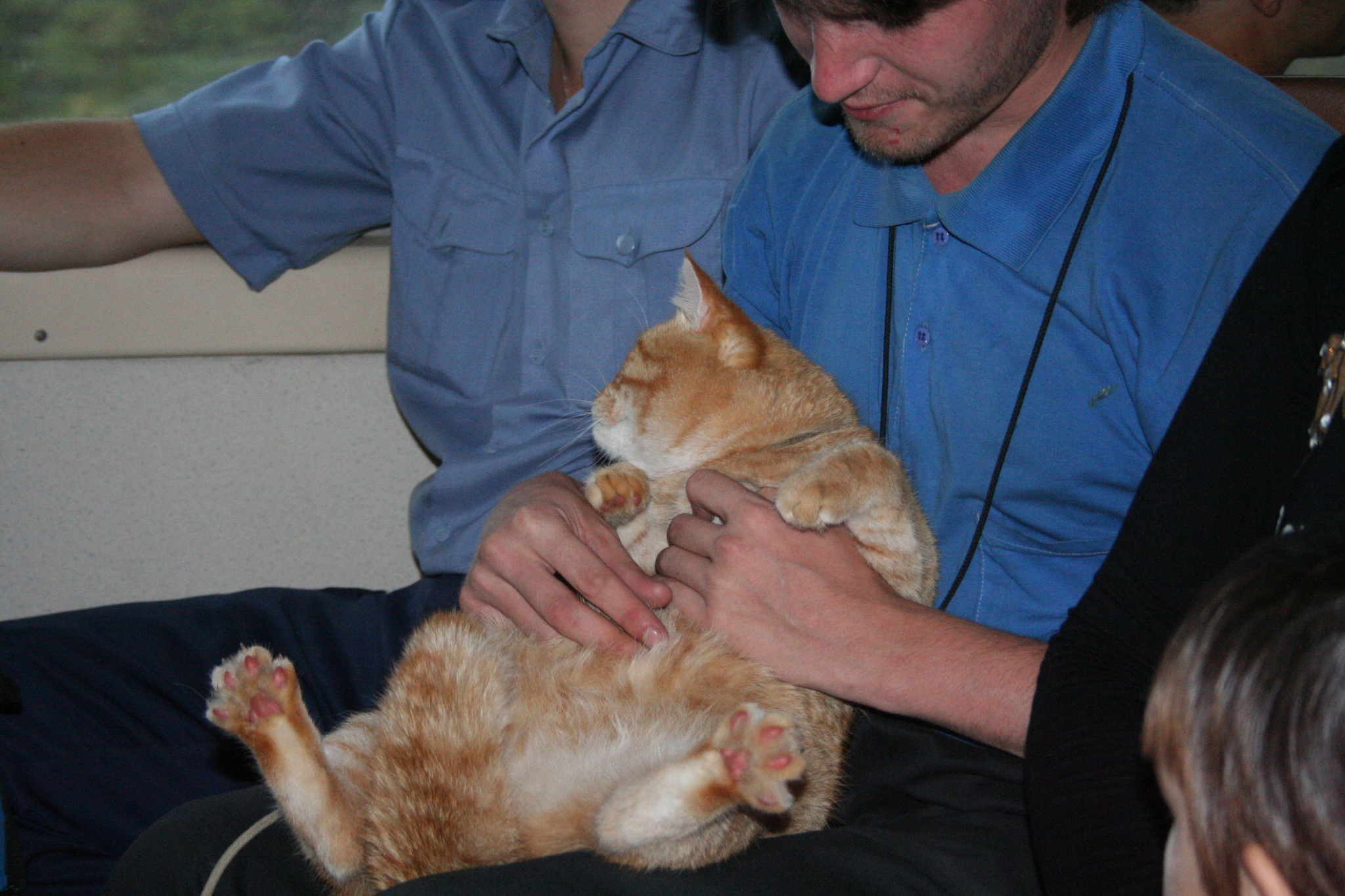 В 2009 году ездили с будущей женой в горную прогулку выходного дня, из Уфы на электричке. На обратном пути нашими попутчиками стали ребята с байдарками и вёслами, а также с довольно большой корзиной. Когда они расселись корзину открыли, и оказалось, что в ней два здоровых кота - рыжий и чёрный. Рыжего хозяйка вытащила из корзины и взяла на руки.