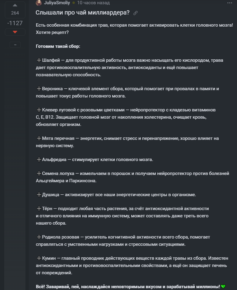 9 iGwath Ответ на пост «Слышали про чай миллиардера?»2 2 года назад да здравствует новое горячее!рейтинг постов - пережиток прошлого, автомодерация на основе рейтинга - от лукавого!только достоверная и проверенная информация и исключительно авторский контент плещется в горячем) ЗОЖ Здоровье Текст Лекарственные травы Правильное питание Лекарства Фуфломицин Скриншот Ответ на пост 1 Ещё 0