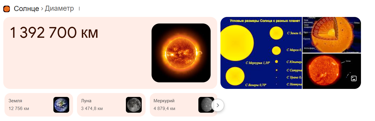 Сначала гуглим диаметр солнца. Обычно говорят о радиусе, но с диаметром нам будет проще работать дальше.