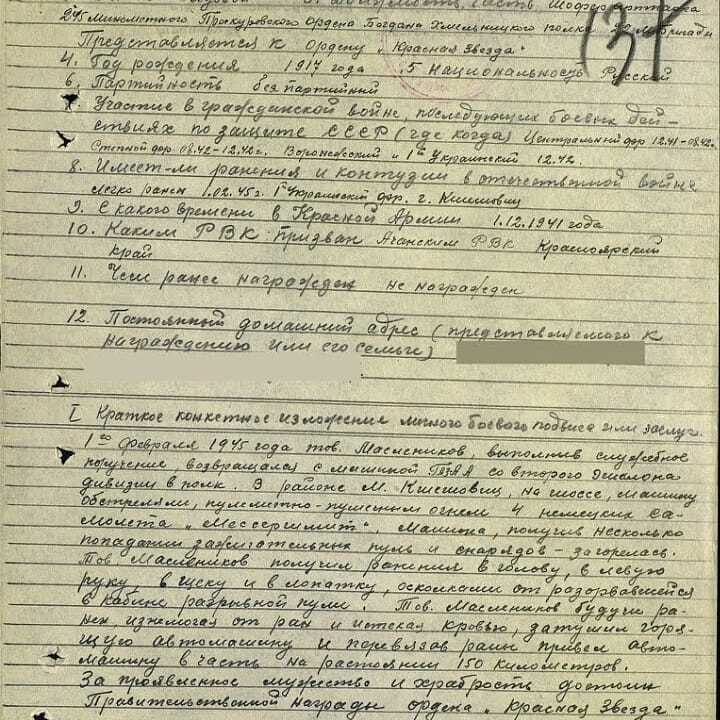 Практически всю войну прошёл. До этого, в феврале 45 был представлен к ордену Красной Звезды, за то что спас свою полуторку, после обстрела четырьмя Мессершмитами. Раненый в нескольких местах осколками, он её потушил и ещё до части гнал, 150 километров. Несколько осколков так и остались под кожей, мама рассказывала, они у него на спине хорошо нащупывались, да и я что-то подобное помню, мне бабушка их показывала.