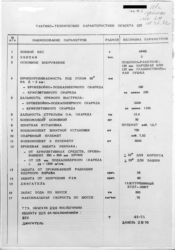 Ленинградские инженеры во главе с Н.С. Поповым создали сразу два проекта перспективных танков: «Объект 225» (не следует путать с проектом 1941 года, также известным под названием КВ-5) и «Объект 226». Они отличались друг от друга некоторыми особенностями конструкции и составом агрегатов. Предполагалось, что в будущем состоится сравнение машин-прототипов, которое позволит определить лучший проект и продолжить его доводку. Аналогичным образом решили поступить с вооружением и силовой установкой. В качестве главного оружия рассматривались орудия калибра 125 и 130 мм, а в моторно-трансмиссионном отделении танка мог располагаться дизельный или газотурбинный двигатель.