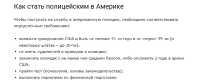 Многие подростки, насмотревшись фильмов и сериалов про американских полицейских (Город гангстеров, Американская история ужасов, Методом проб и ошибок) мечтают стать представителями закона и служить на пользу населения и в честь правосудия. Стать полицейским в США может не каждый житель, поскольку необходимо соответствовать ряду требований: