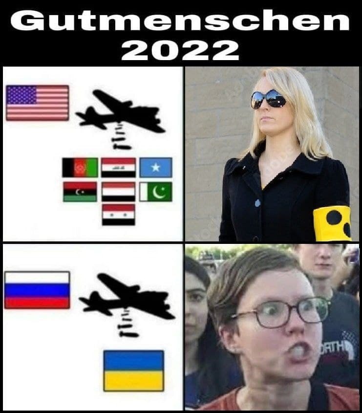 Я совершенно не оправдываю войну против Украины. Но не понимаю, почему тогда когда Бундесвер с США бомбил Сирию (в том числе ошибке разбомбил приют для беженцев), вы никуда не выходили, вас совершенно все это не интересовало, а теперь -