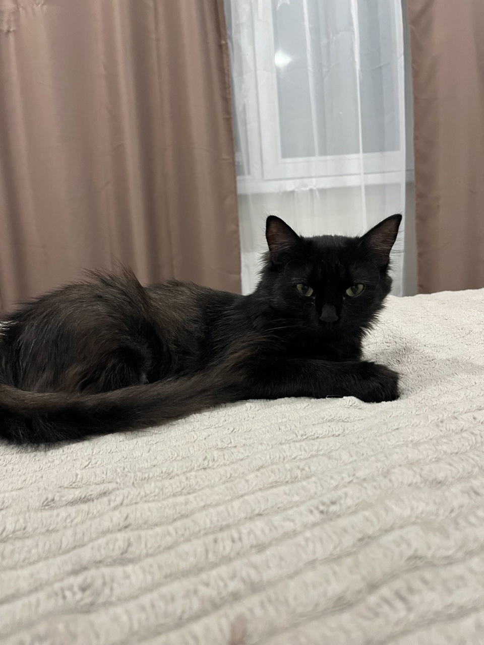 Вначале она пряталась под раковиной в туалете, но там ее легко было достать, и она начала искать более укромные места. В итоге всю неделю до нг она жила за шторой в спальне. Я туда носила ей еду и питье, с лотком у нее все получилось супер, я забирала ее из укромного местечка за шторой, относила в лоток, она садилась и сразу все делала. Иногда сидела со мной на кровати. Выглядело это чудо вот так: