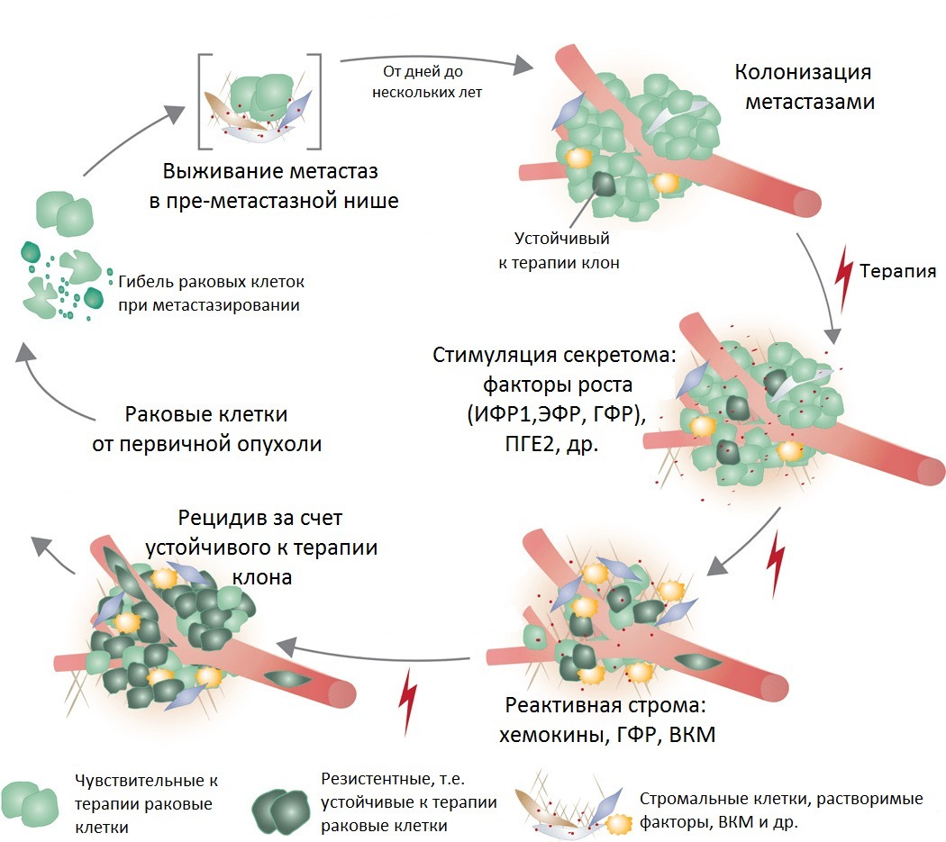 Коварство опухолевой клетки состоит в том, что она адаптируется (приспосабливается - лучше перебдеть) к условиям (условиям чего? Похоже, тут слово пропущено. Я в таких случаях просто вычёркивал непонятность) и к нашему лечению.