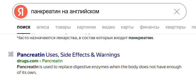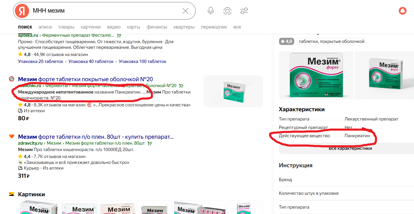 - вы по рекомендации врача пьёте Мезим. В ГРЛС или любым способом ищете МНН или действующее вещество. Потом ищете его название на английском. For example