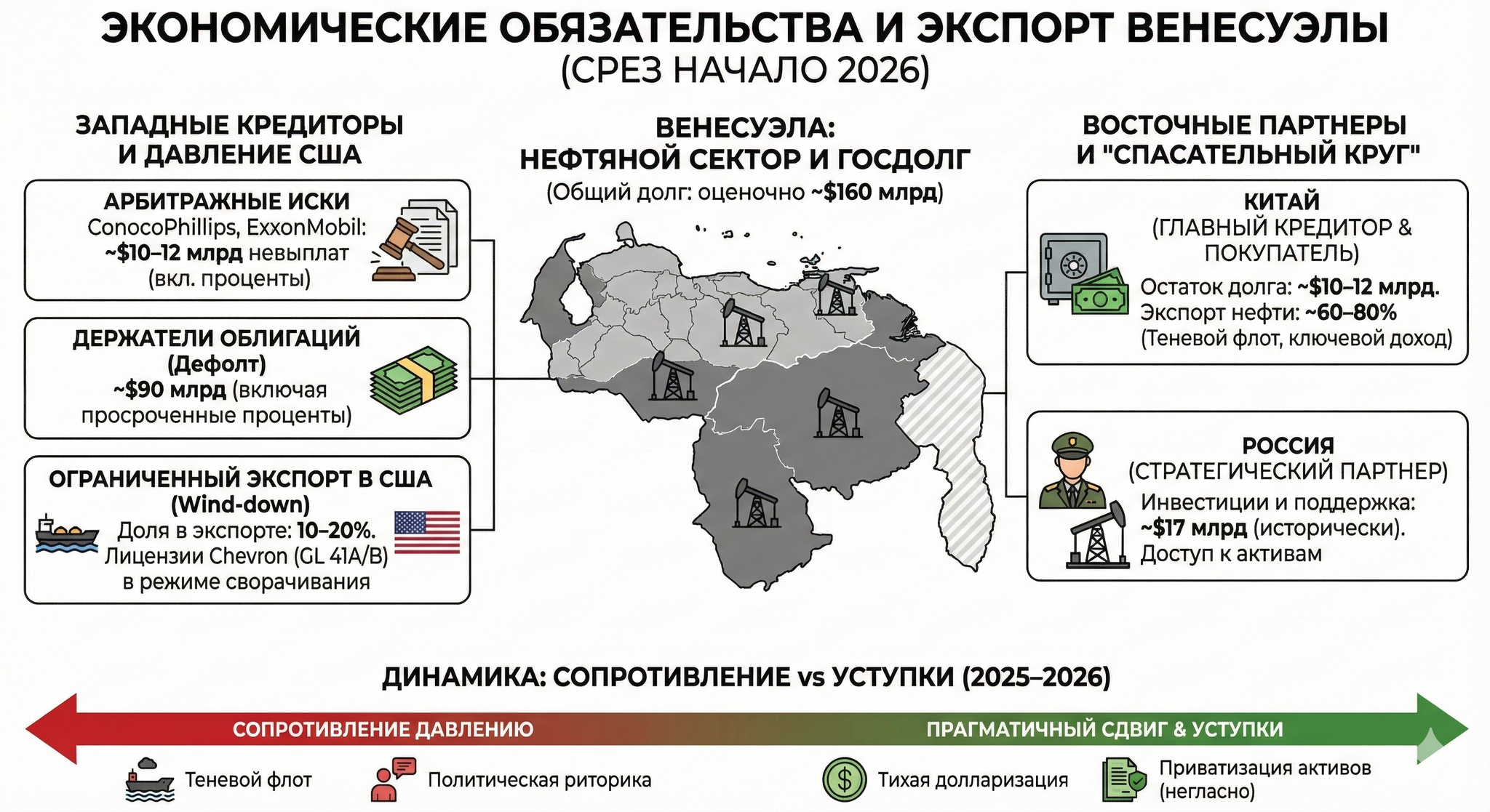 Holland & Knight / Energy News Beat: Судебные решения по национализации 2007 года. ConocoPhillips отсудила около $8.7–10 млрд, ExxonMobil — около $1.6–2 млрд. На конец 2025 года большая часть этих сумм остается невыплаченной.