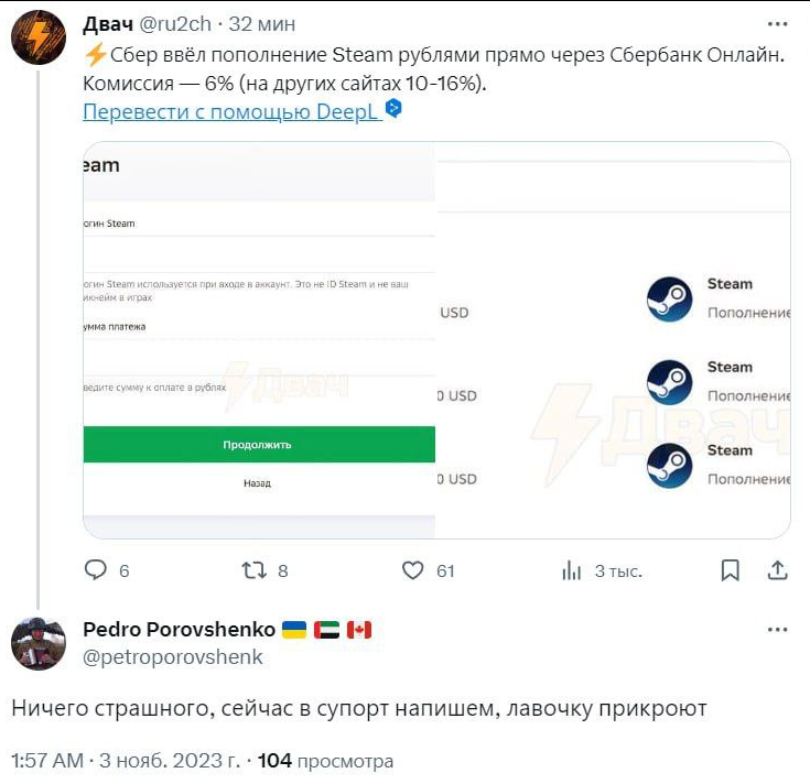 10 lakosa Баяны Ответ на пост «Теперь можно пополнять аккаунт Steam с небольшой комиссией»5 2 года назад Steam Сбербанк Онлайн Пополнение Steam Скриншот Ответ на пост 1 Ещё 0