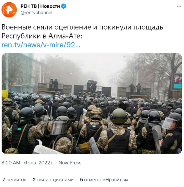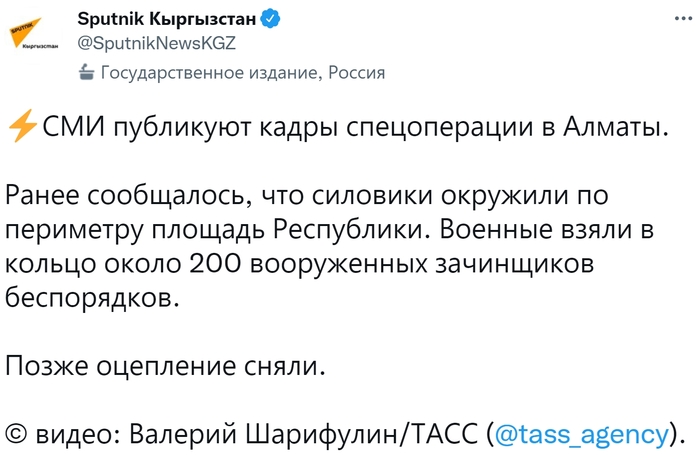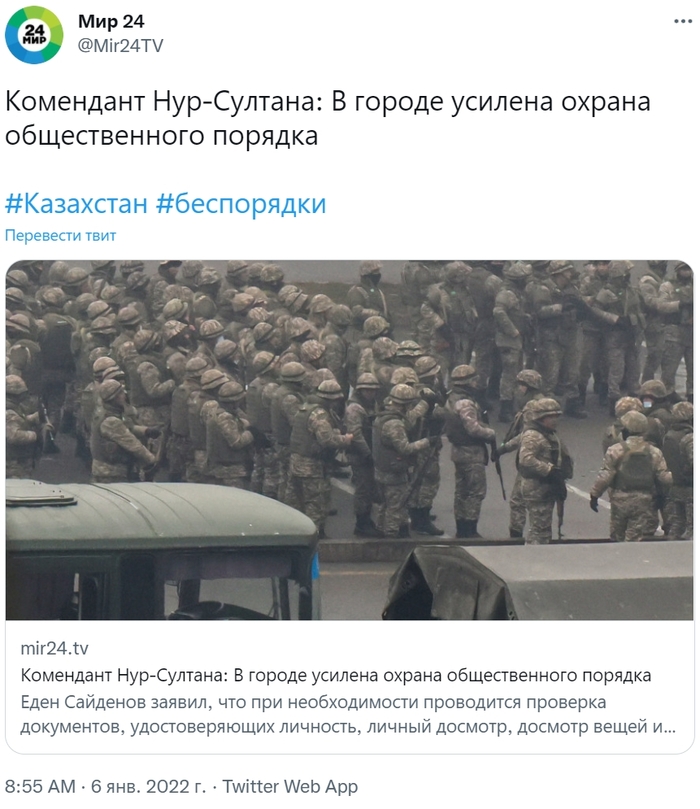 Президент Казахстана запросил помощь у партнеров по ОДКБ. Организация направила миротворцев в Казахстан для охраны государственных и военных объектов, а также для содействия силам правопорядка