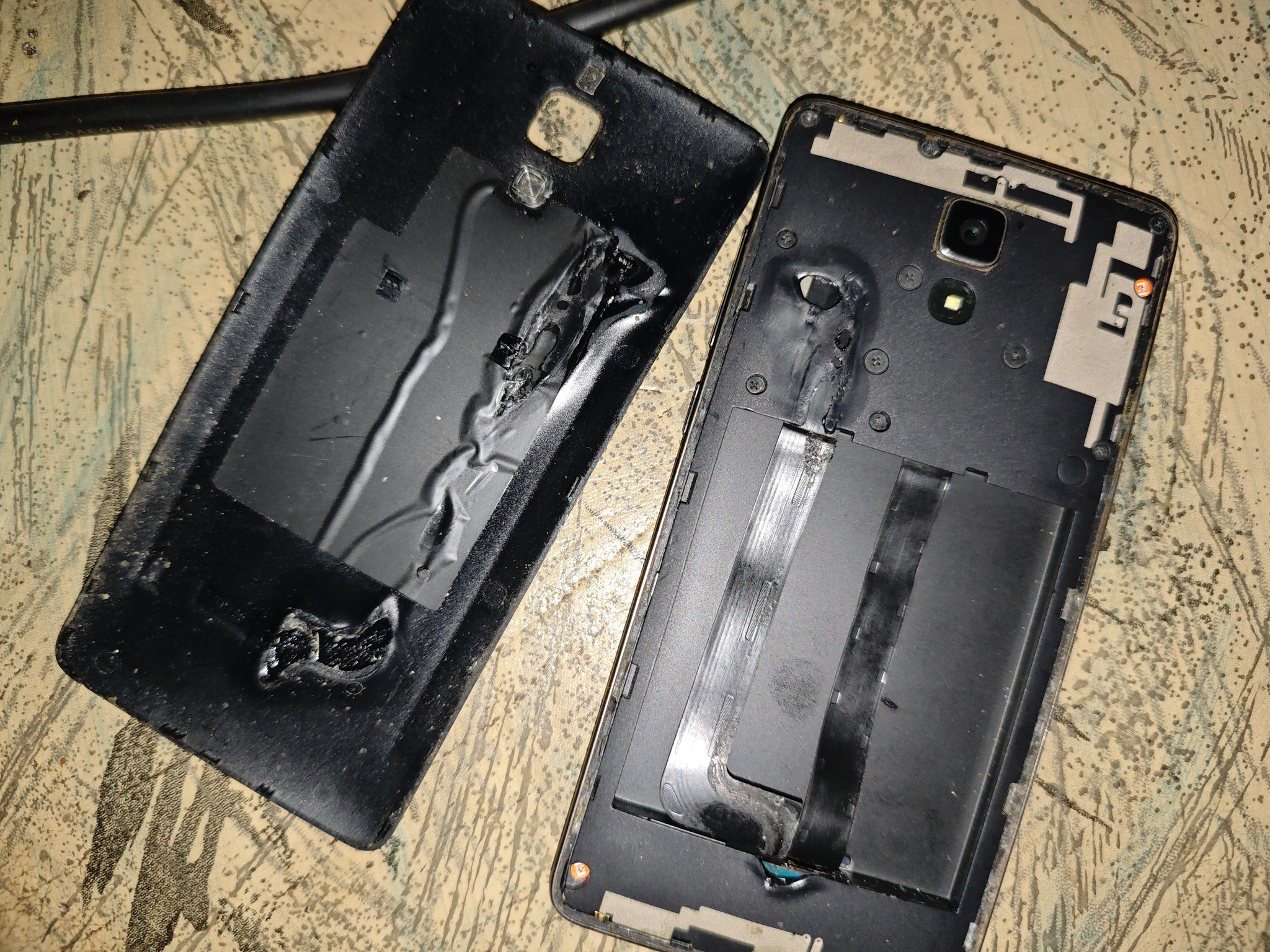 У меня так телефон загорелся. Поставил на зарядку и пошёл на улицу. Вспоминал что забыл телефон, вернулся, а он лежит дымится- крышка проплавилась. На фото нет батареи уже. Я ее выкинул. Ещё до этого небыло меня неделю, приезжаю дома горелым пахнет - загорелся блок питания роутера, повезло что рядом нечему было особо гореть. Фото этого безобразия как раз остались в сгоревшем телефоне)