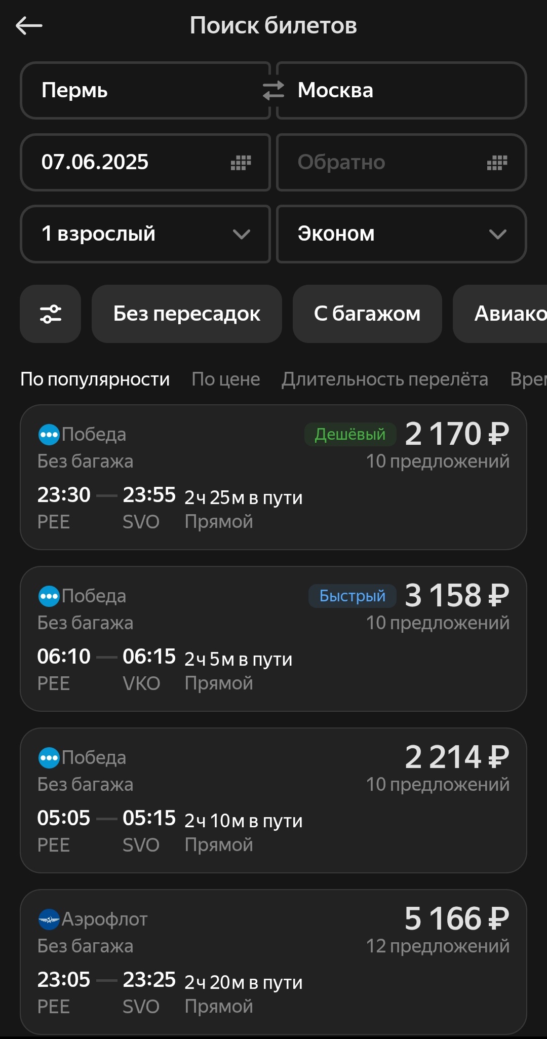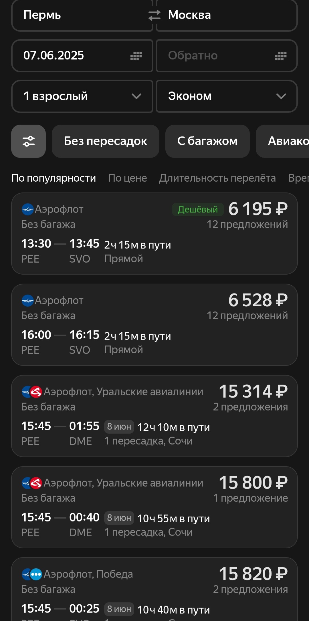 Чет я редко на вбросы реагирую, но тут прям захотелось. Крч, барышня (барышня ли?) на пикче утверждала, что самолет помимо того, что быстрее, еще и дешевле. Интересное заявление. Собственно, я решил обратиться в интернет, может я и правда чего-то не знаю. Я вбил в поиск "авиабилет пермь москва", так как живу в Перми. Вот че мне выпало: