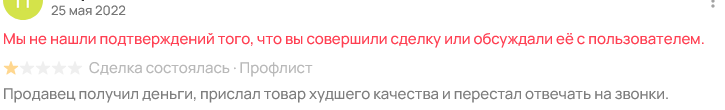 - Отзыв отклонен, так как "Мы не нашли подтверждений того, что вы совершили сделку или обсуждали её с пользователем.".