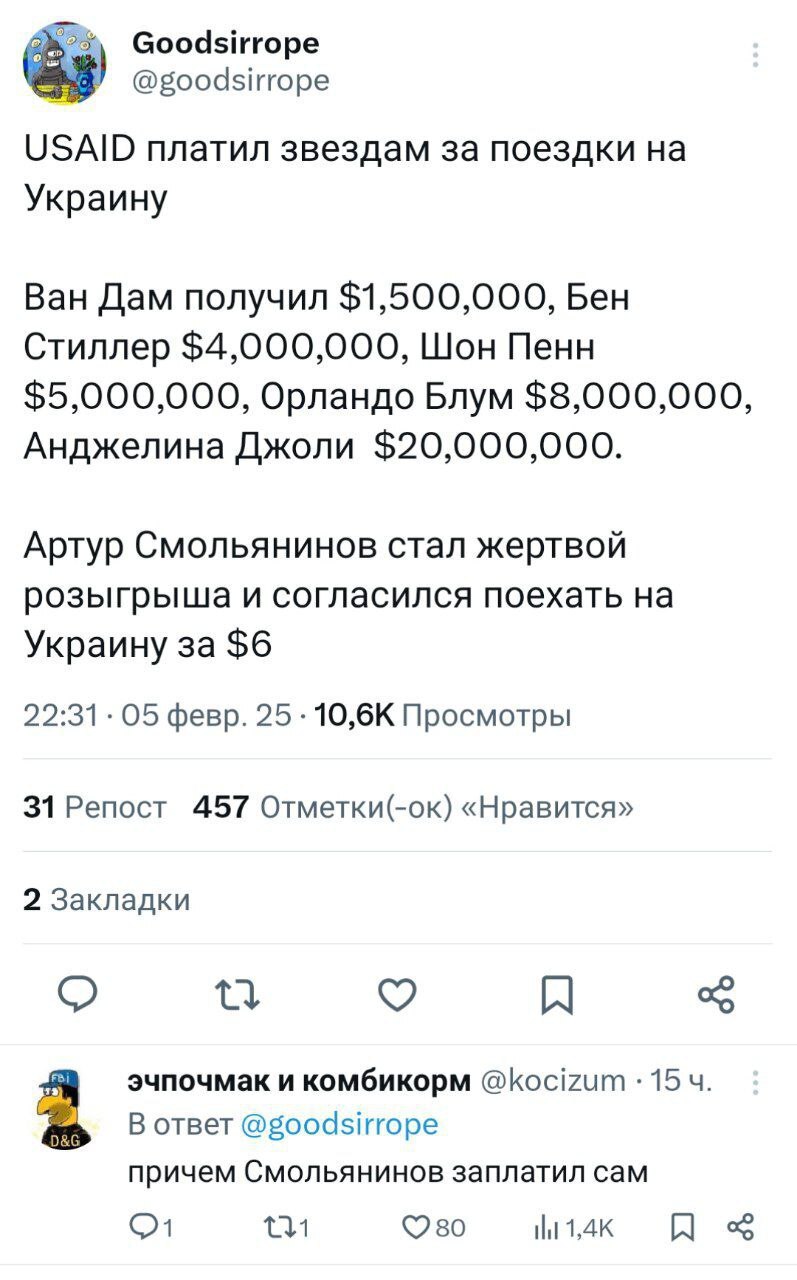 217 Bigstone14 Политика Ответ на пост «USAID платил голливудским звездам за поездки на Украину»8 1 год назад Сам твит: https://x.com/goodsirrope/status/1887222625912434854 Пруфы из исходного поста чтобы не снесли: Пруф 1: https://glasnarod.ru/mir/za-poezdki-na-ukrainu-gollivudskie-... Пруф 2: https://tsargrad.tv/news/usaid-finansirovalo-vizit-gollivuds... Fake News Политика Украина Спецоперация США USAID Киев Волна постов Ответ на пост Артур Смольянинов 22 1 1 Ещё 0