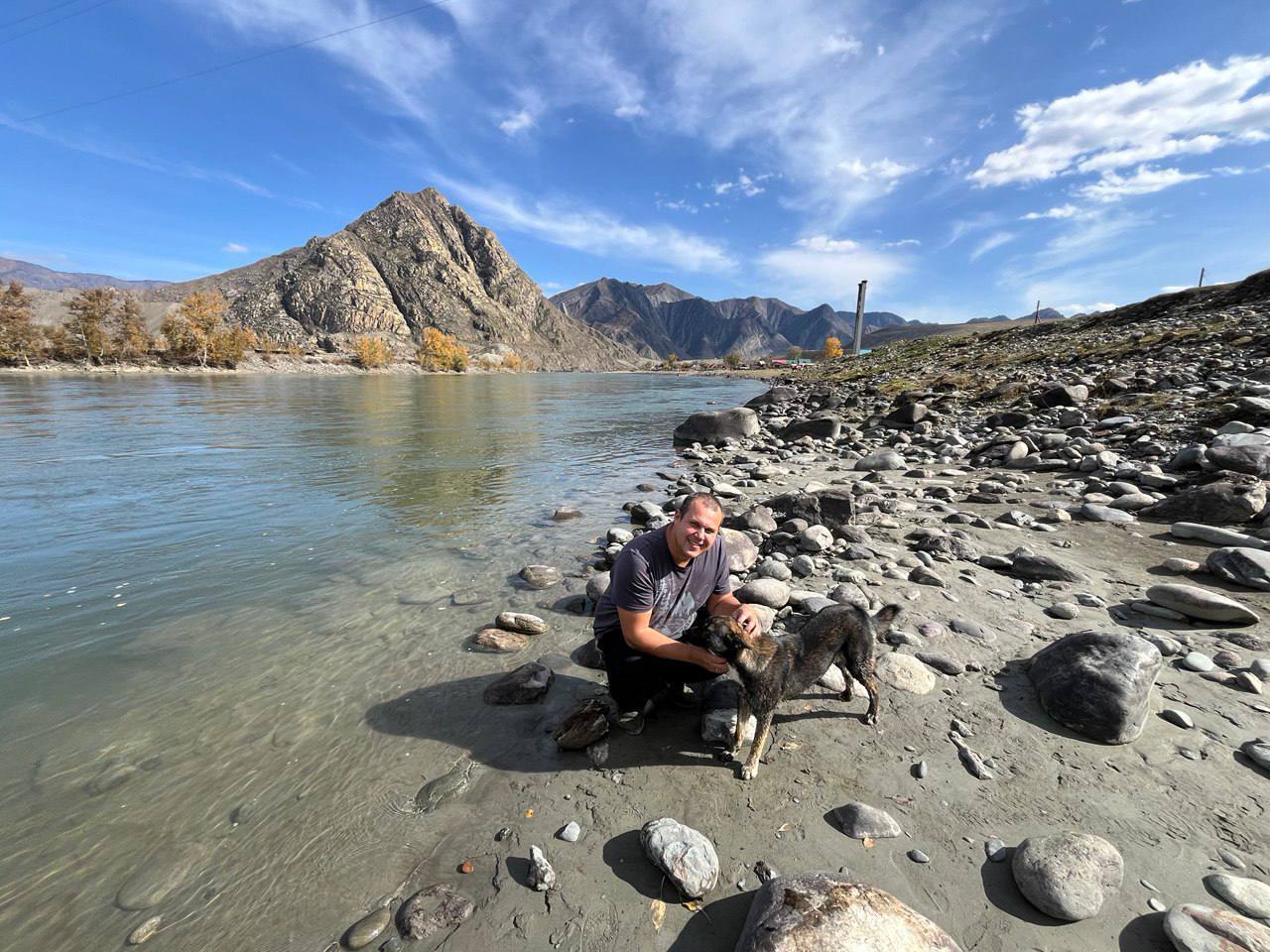 После перевала спустились к реке Катунь. Пока стояли у воды, к нам дружище местный заглянул и очень настойчиво просил почесать его)) Катунь оказалась не такой чистой, как мы думали и цвет у неё был обычный, летний - бирюзовый.