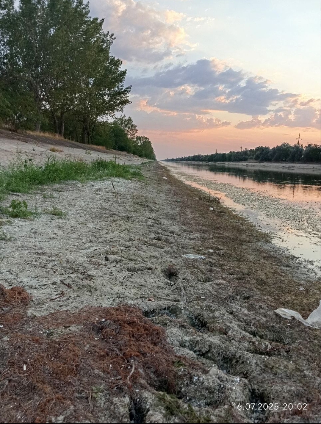 Вид Каховского магистрального канала возле села Велетневка. Вода ушла метрров на 5. Рукава которые отходили водными артериями по всей Таврии вообще сухие
