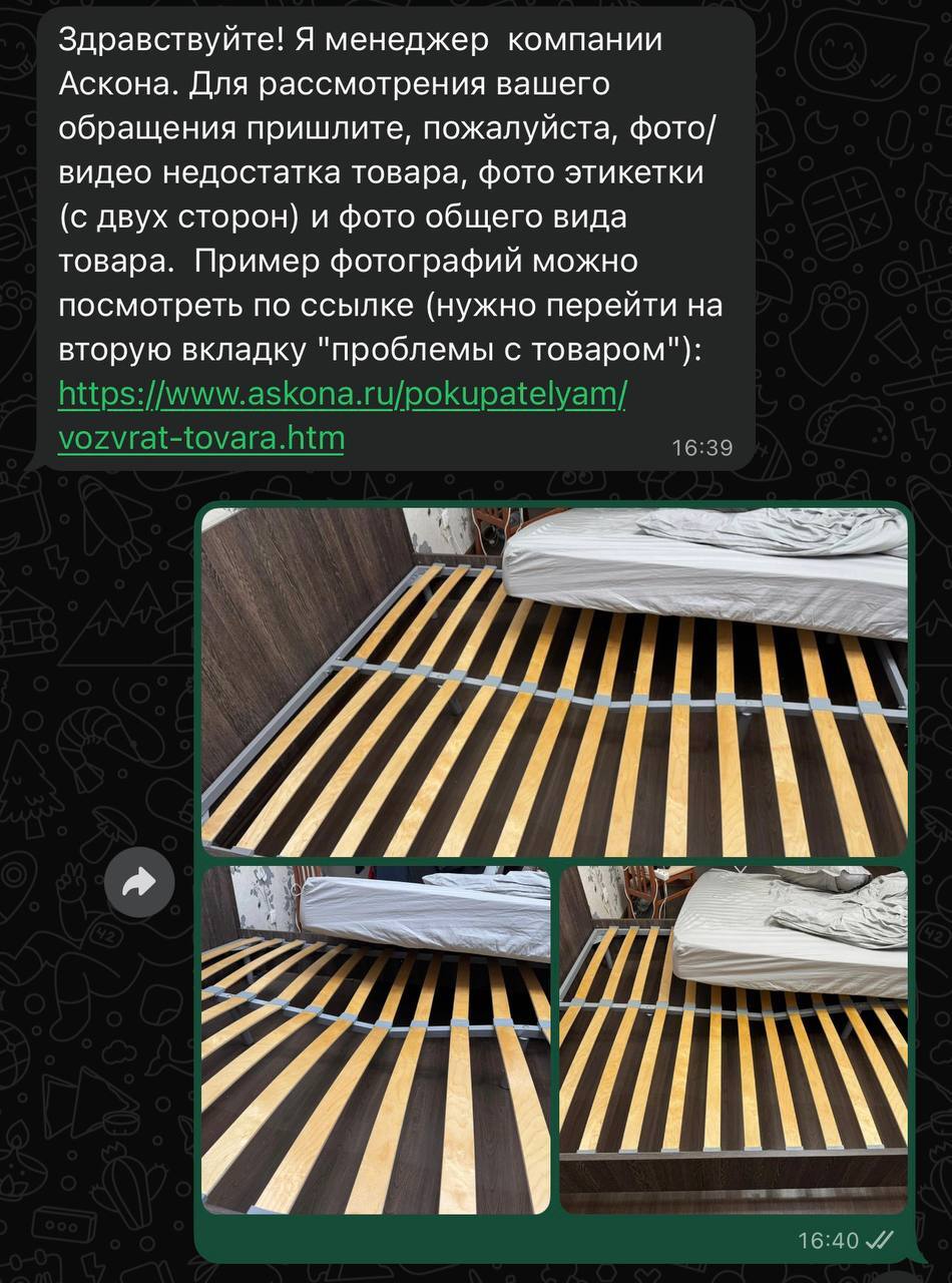 Находясь в не добром здравии, плюхнулся на кровать, только с утра обнаружил неладное, матрас будто бы провис, образовалась яма. Сдвинул матрас, обнаружил что погнул центральную балку. Набрал в Аскону, описал ситуации, хотел купить новую балку, либо же новое основание (только металлический каркас), менеджер сказала, что не надо ничего покупать, кровать на гарантии и оформила обращение.