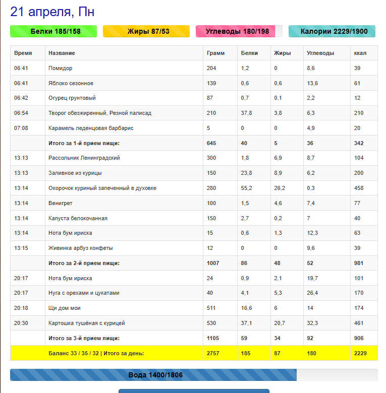 В общем кушайте в свое удовольствие, но не забывайте про норму. Сейчас у меня 21 час 15 минут и я пошел ужинать. У меня еще почти 400 калорий. Скушаю рыбки и огурчиков с помидоркой, а на десерт пудинг и чай с печенькой и медом.