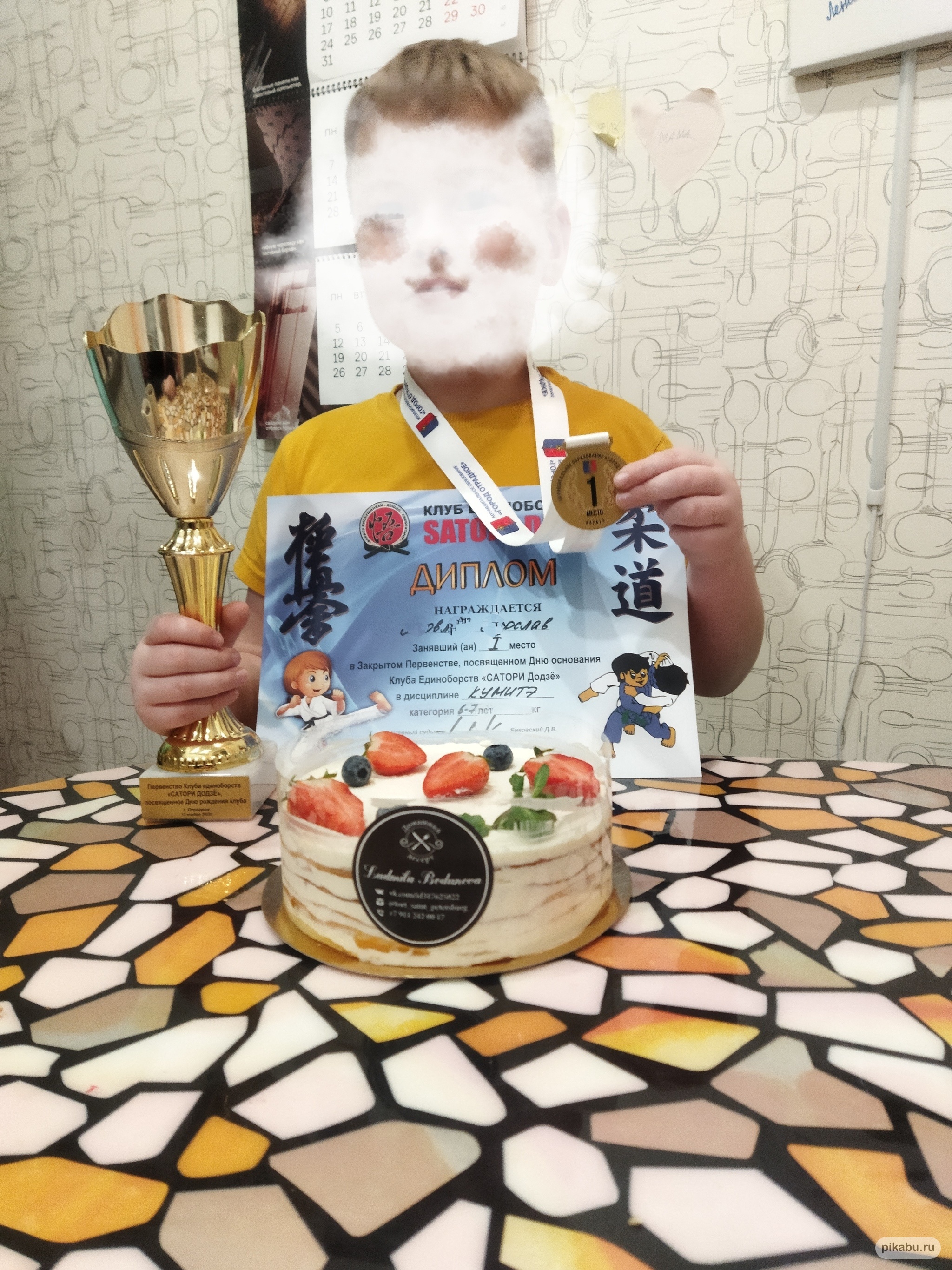 Подготовились физически -тактика,отработка ударов и тд.В день соревнования, на нервах вся группа поддержки,кроме сына,ему комфортно.Первый бой ..единогласным реением судей побеждает мой сын-я чуть в штаны от радости не наделал.По итогу ,в бою за первое место с соперником(тот мальчик,которому он дал в зубы и инициатор драки в раздевалке)(Р),мой сын выигрывает.Радость,эйфория-всё на свете ..Это его первая спортивная награда,первые соревнования, при чём сразу первое место,я к чему это всё?-врядли он уйдет в профессиональный спорт или станет великим каратистом или ещё кем ,но спорт нужен,у сына поднялась самооценка,он стал верить в себя ,а это-главное.