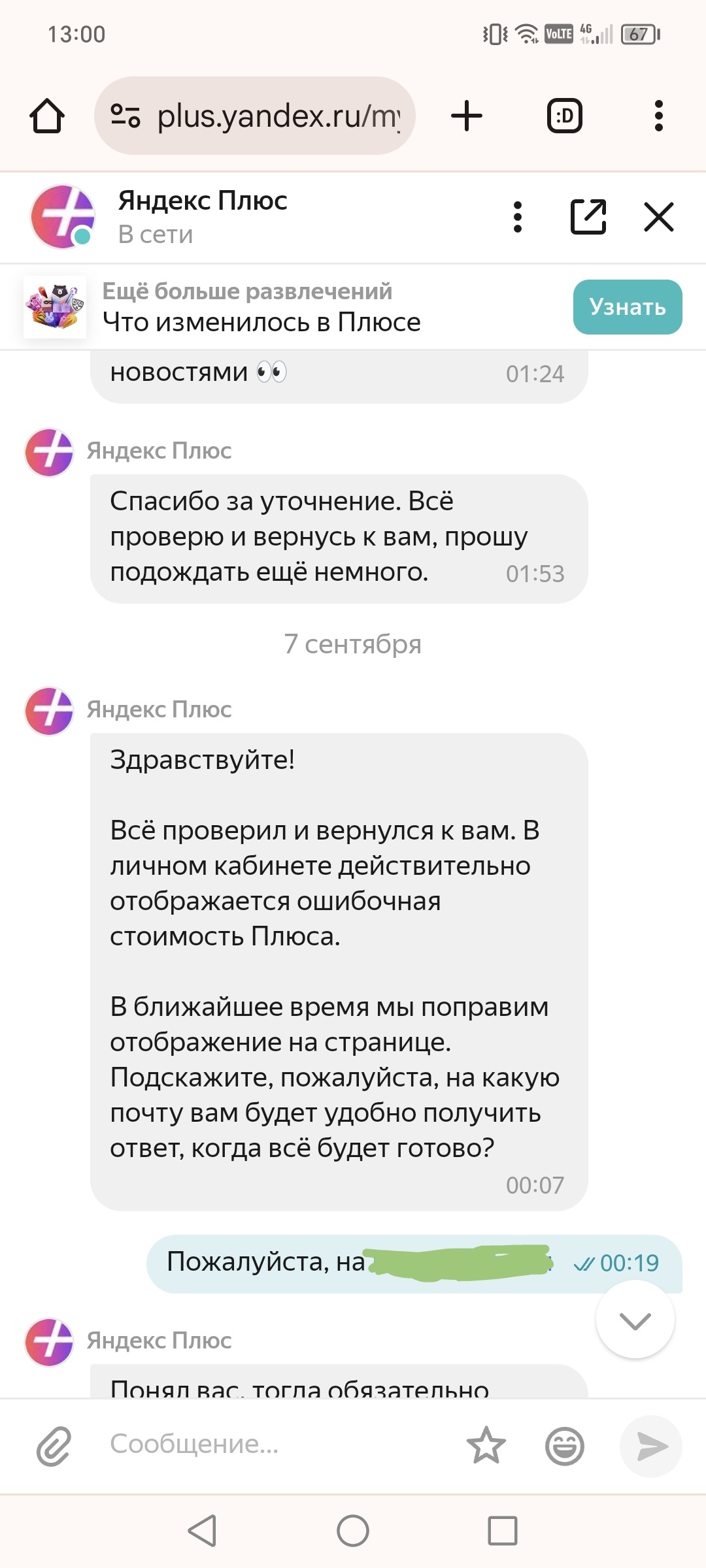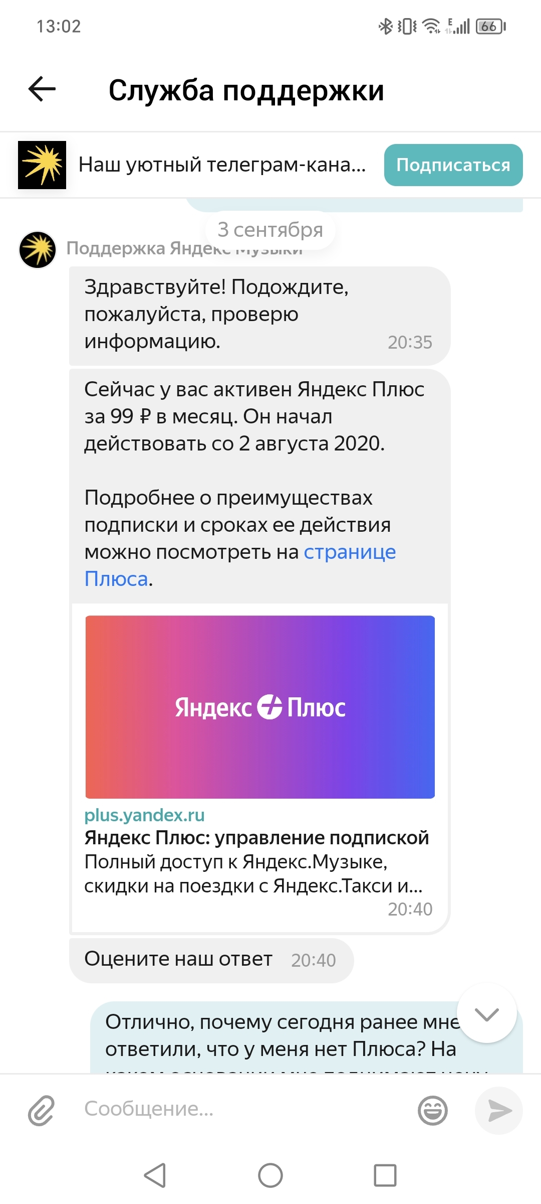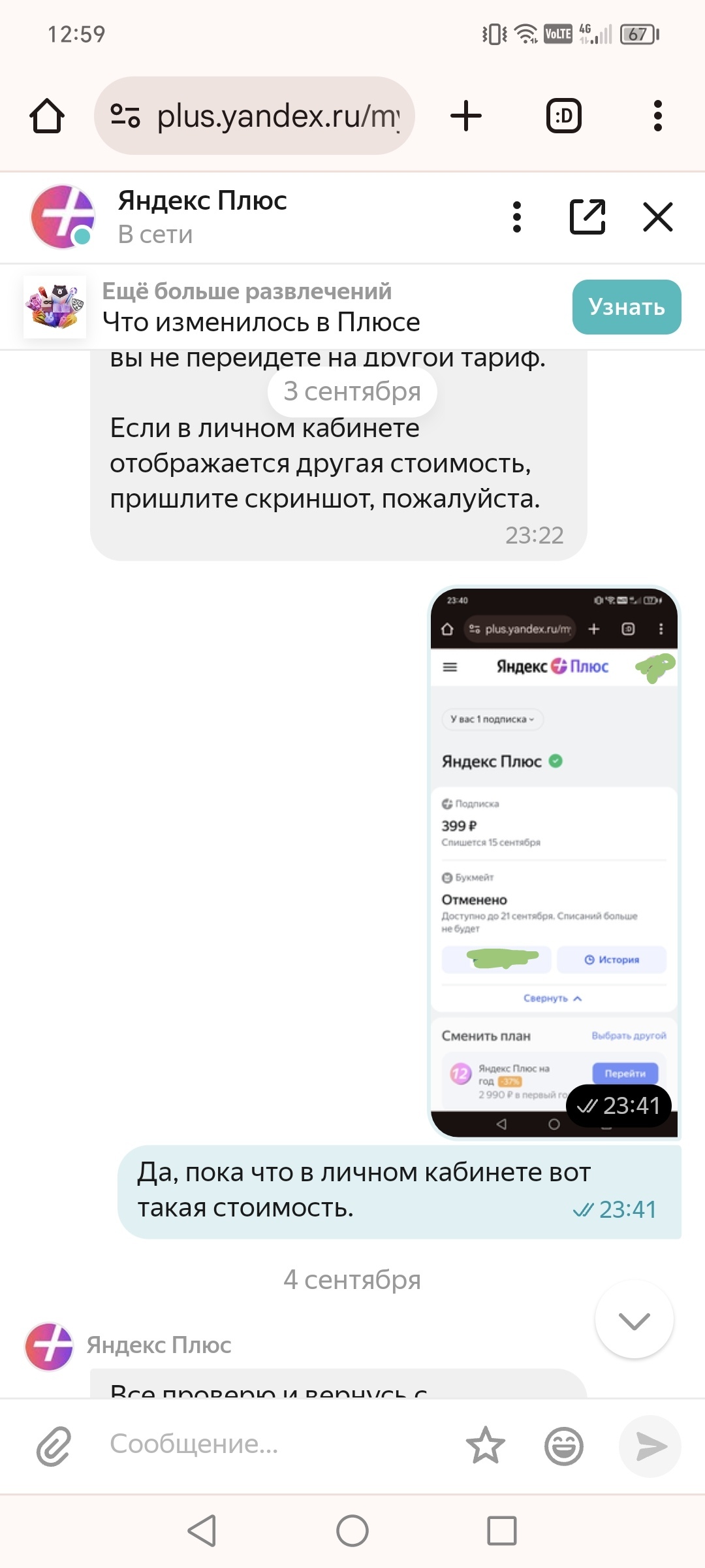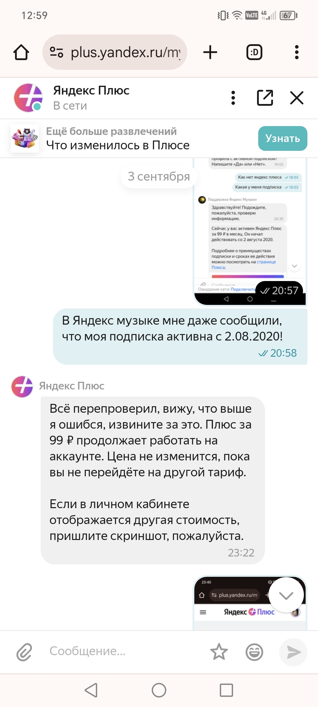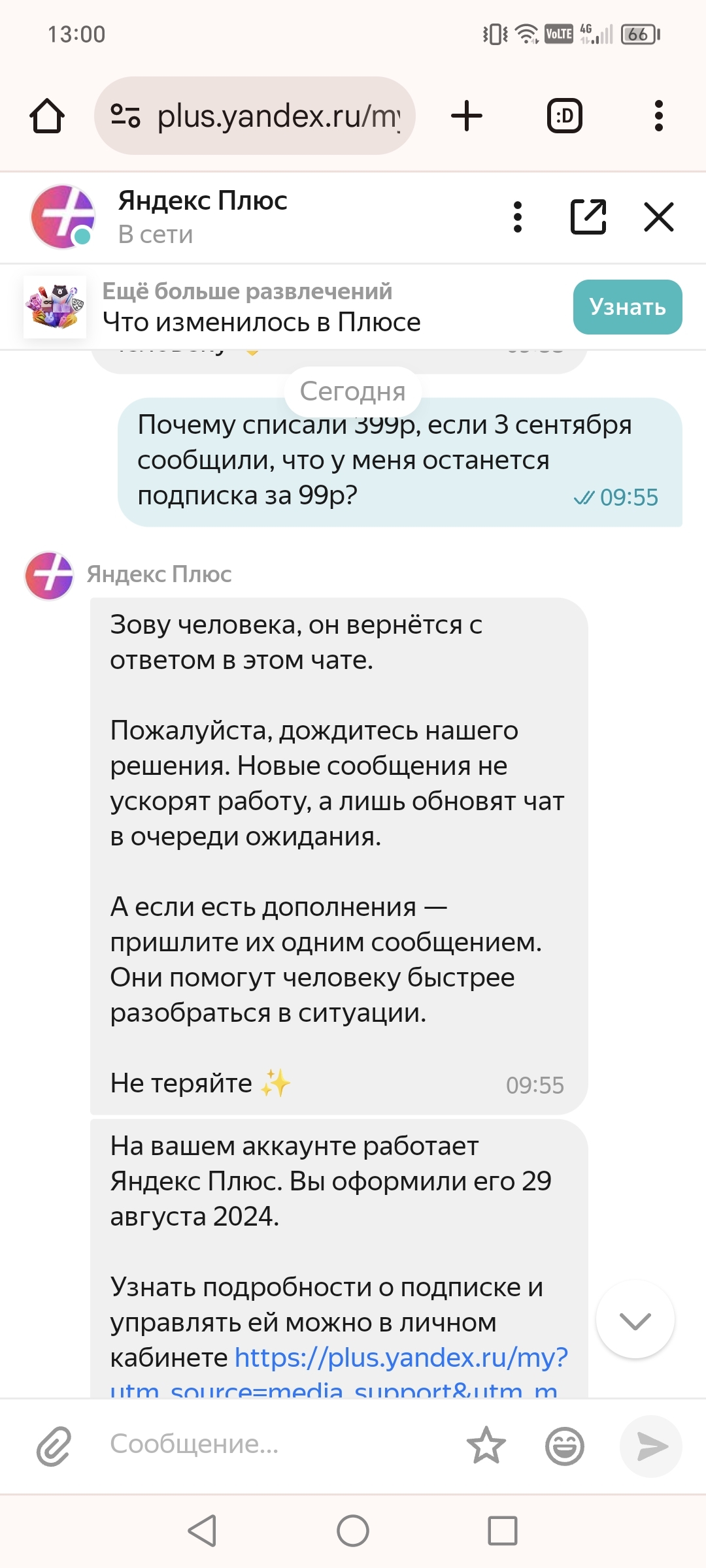 И что происходит дальше? Сегодня день списания и Яндекс пытается списать 399р! Иду в чат, спрашиваю что происходит, а мне ещё и сообщают, что якобы у меня подписка оформлена 29.08.24! Что за рандомная дата? В Яндекс.музыке мне до этого сообщали, что подписка моя со 2 августа аж 2020 года. Да и история оплаты есть, каждый месяц исправно по 99р списывали. Короче, @YandexPlus, ну что опять не так, разберитесь уже!