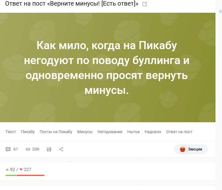 Как мило, когда на Пикабу негодуют по поводу буллинга и одновременно просят вернуть минусы.