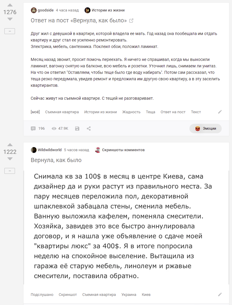 Месяц назад звонит, просит помочь переехать. Я ничего не спрашивал, когда мы выносили ламинат, вагонку снятую на балконе, всю мебель и розетки. Уточнил лишь, снимаем ли унитаз. На что он ответил "Оставляем, чтобы теще было где воду набирать". Потом сам рассказал, что теща резко передумала, увидев ремонт и предложила им другую свою квартиру, а в эту заселить квартирантов.
